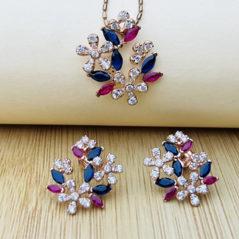925 Sterling Silver Rose Gold Floral Pendant Set with Ruby & Blue Sapphire CZ Stones