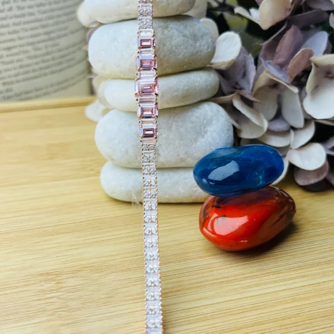 925 Sterling Silver Rose Gold Pink Baguette CZ Tennis Bracelet – Elegant Two-Tone Statement Bracelet