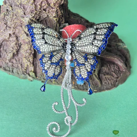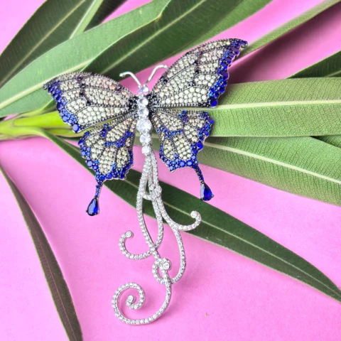 Elegant Silver Butterfly Brooch with Blue & White Stone Detailing