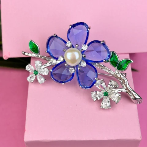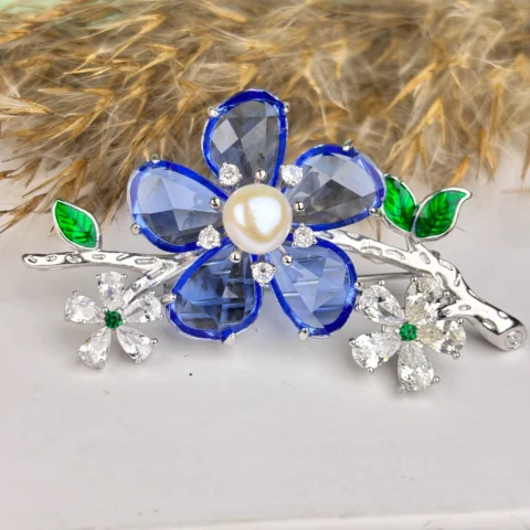 Floral Silver Brooch with Blue Stones, Pearl & Crystal Detailing
