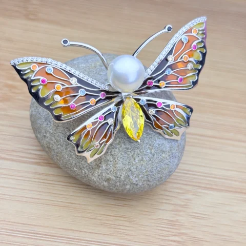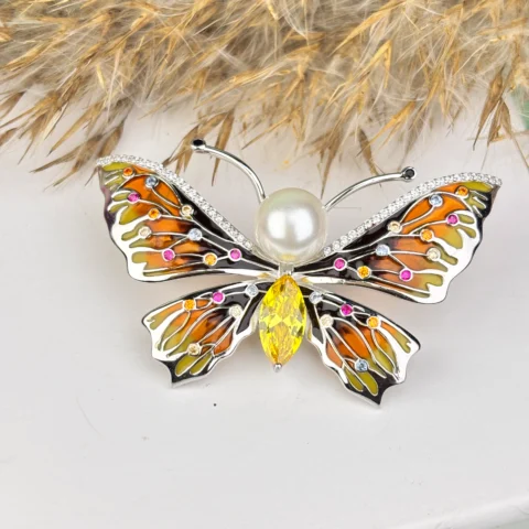 Elegant Silver Butterfly Brooch with Pearl & Multicolor Gemstones