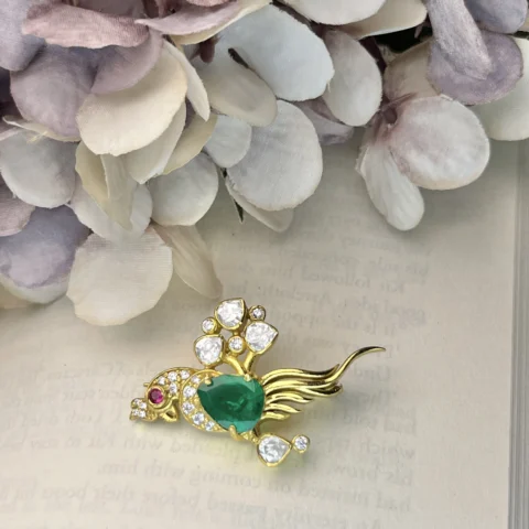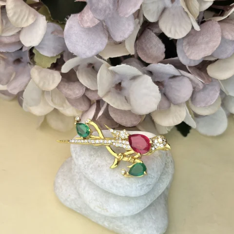 925 Sterling Silver Gold-Plated Bird Brooch with Ruby, Emerald & CZ Stones