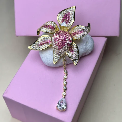 925 Sterling Silver Gold-Plated Pink CZ Floral Statement Brooch with Dangle Drop