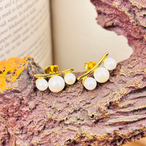 Graceful Triple Pearl Silver Earrings with Gold Finish