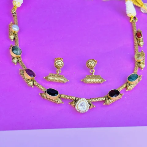 Traditional Silver Hasli Necklace with Multicolor Stones & Matching Earrings