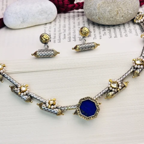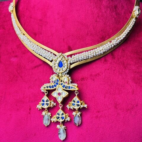 Handcrafted Silver Hasli Necklace with Blue Stone Pendant & Kundan Pearl Detailing