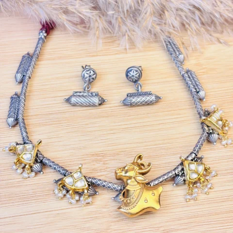 Antique Silver Hasli Necklace with Ox Motif & Pearl Embellishments
