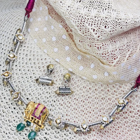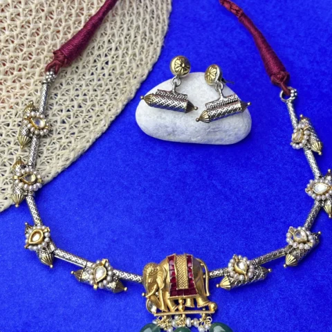 Antique Silver Hasli Necklace with Elephant Motif & Pearl Detailing