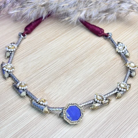 Handcrafted Silver Hasli Necklace with Blue Stone Pendant & Kundan Pearl Detailing