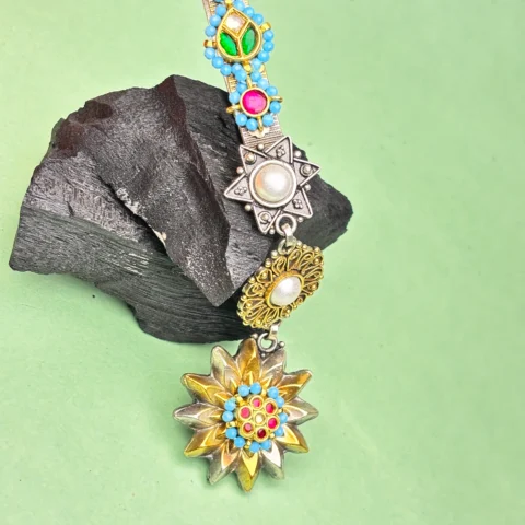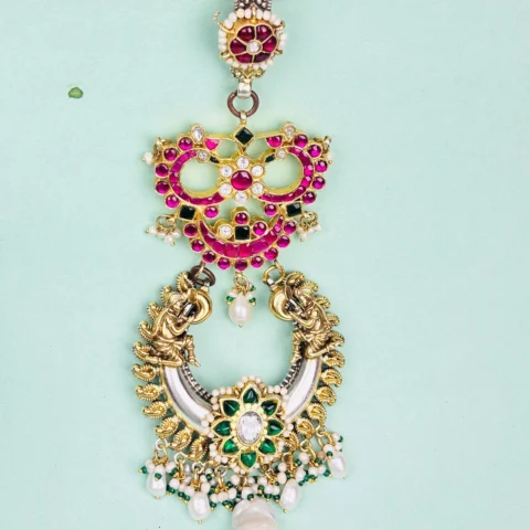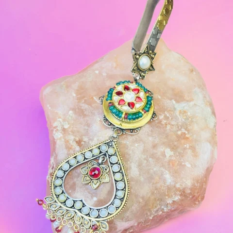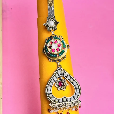 Antique Silver Keyring with Kundan Work, Golden Beads & Pink Stone Detailing