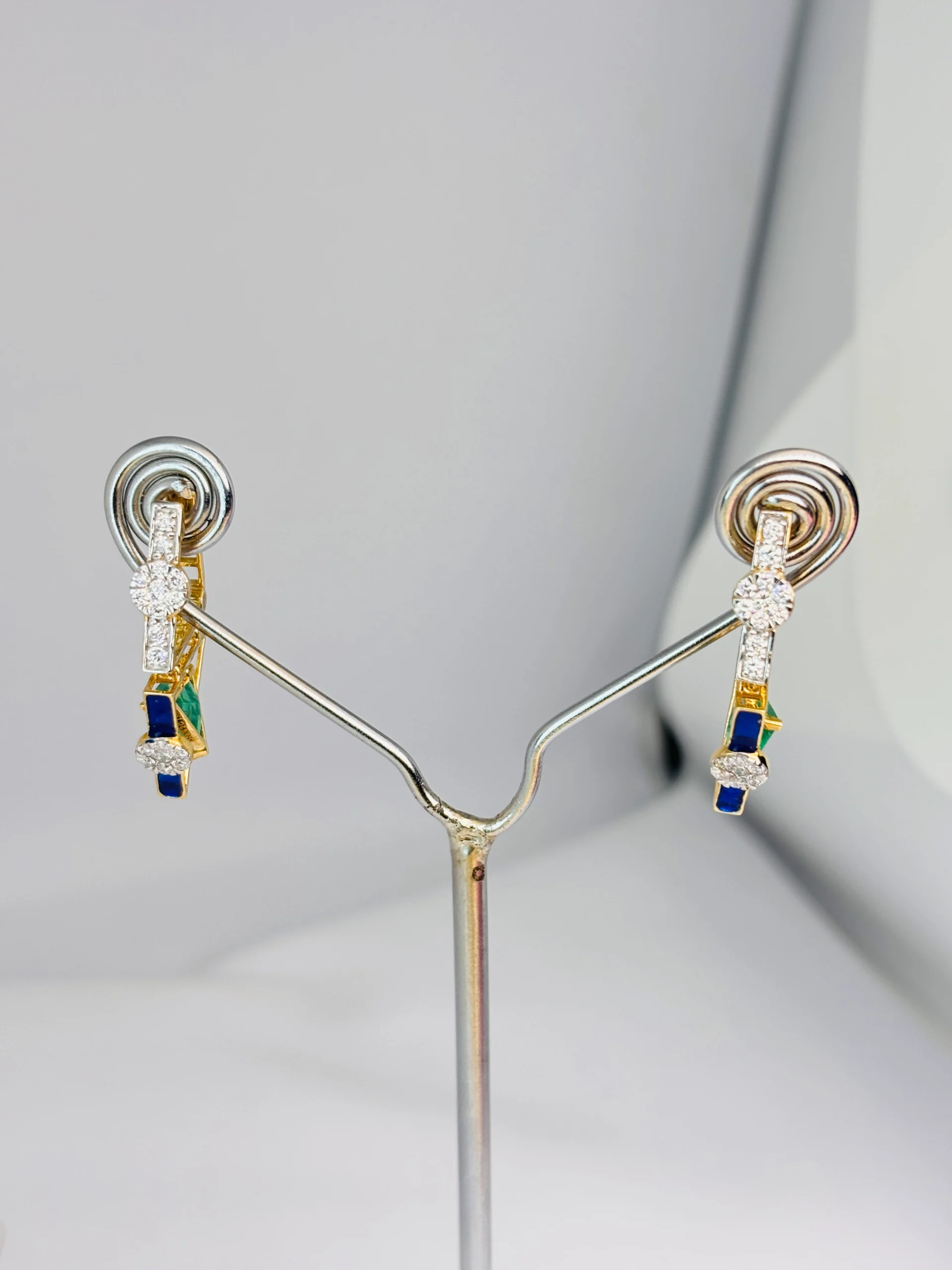 Each earring is adorned with brilliant-cut natural diamonds that catch the light beautifully, complemented by rich royal blue enamel accents and striking emerald-green stones for a pop of color. The combination of yellow gold, diamonds, and bold color creates a sophisticated yet playful look—perfect for both daily wear and special occasions.