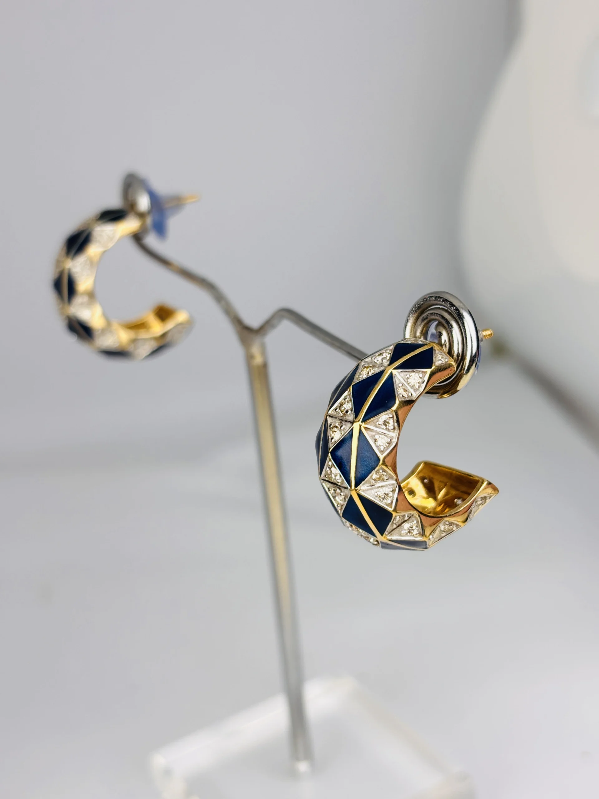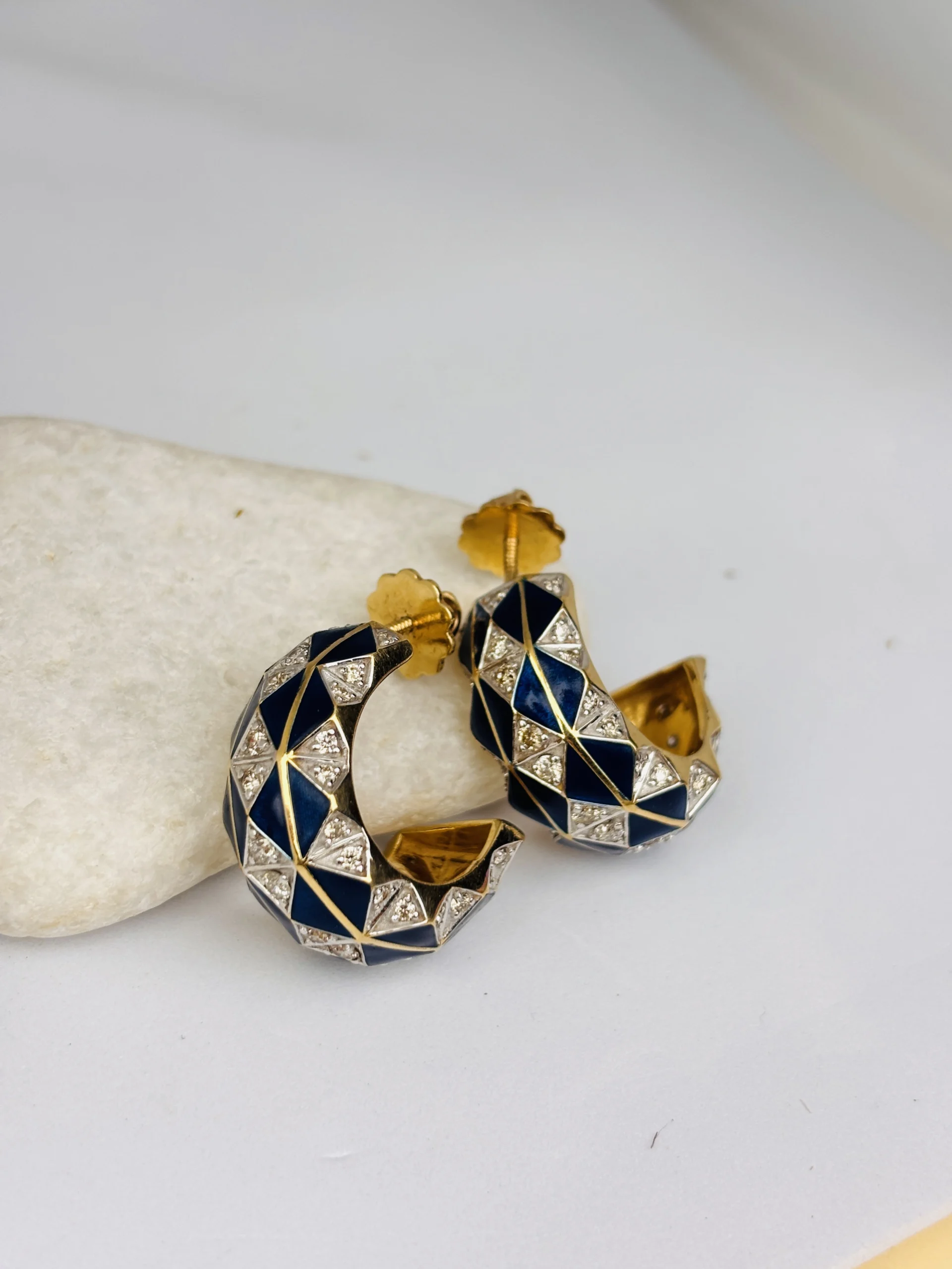 Each piece is meticulously finished with high-polish gold edges that frame the enamel and diamonds, creating a dramatic contrast and a rich, modern aesthetic. The crescent-shaped silhouette adds depth and dimension, offering a powerful yet elegant look that stands out effortlessly.