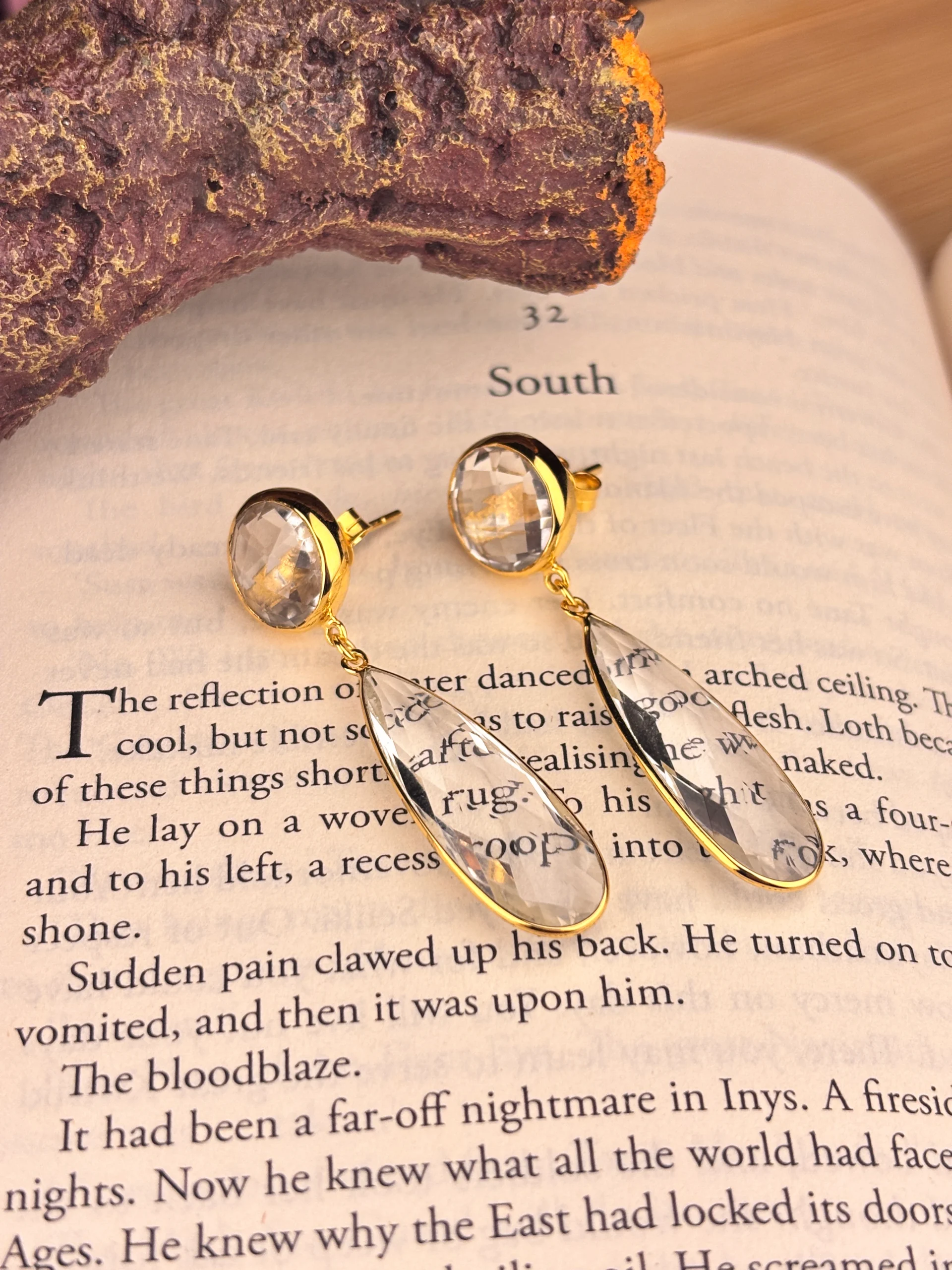 Designed with elegance in mind, the earrings showcase a unique teardrop silhouette framed in smooth gold-plated silver. A delicate golden floral motif is artistically placed on the edge of each stone, adding a refined handcrafted touch. The lightweight French hook design ensures comfortable all-day wear.