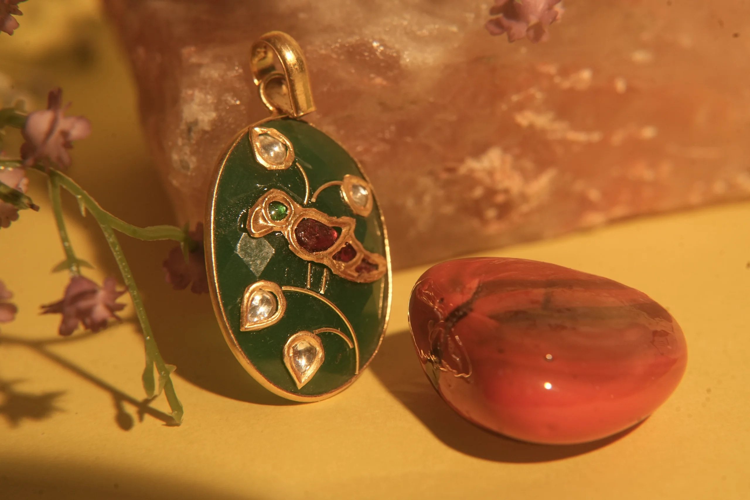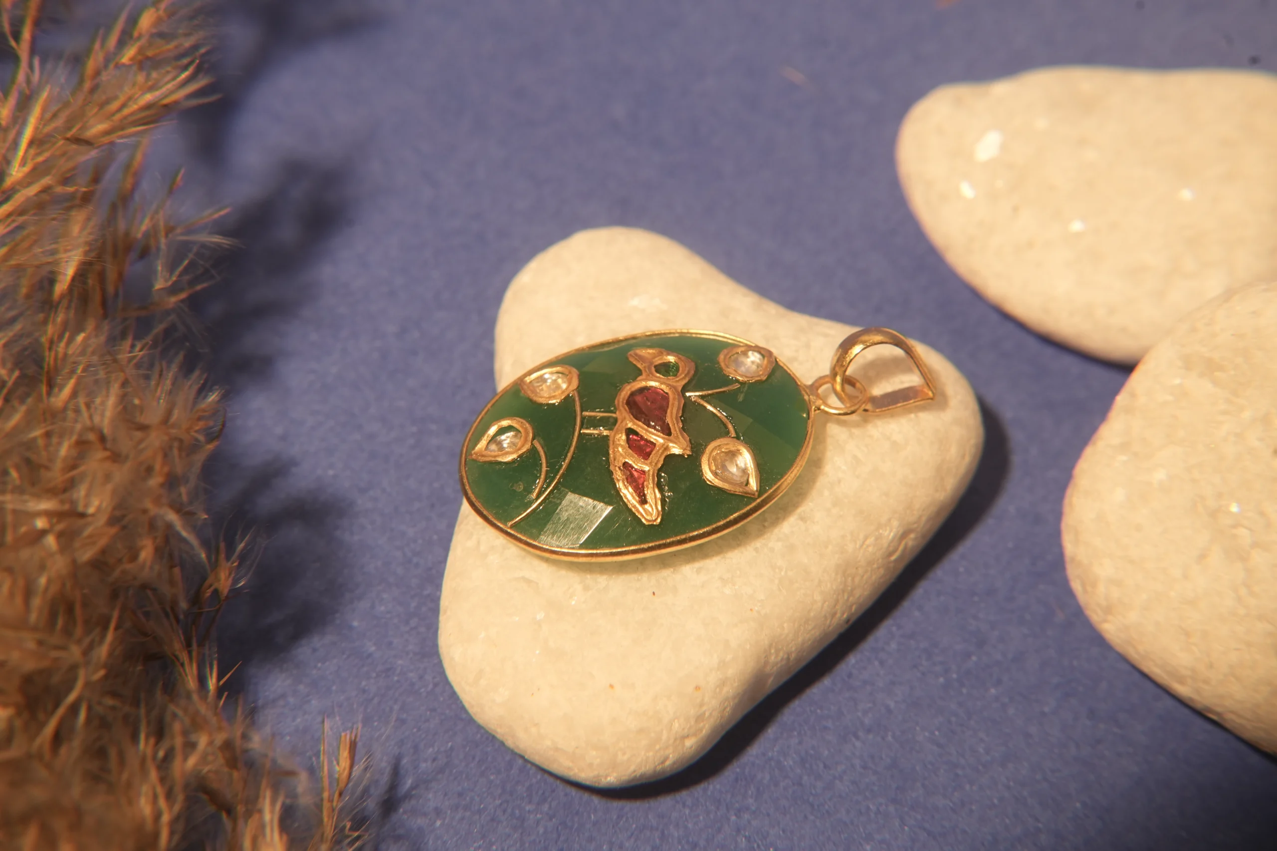 Handcrafted with attention to detail, this pendant combines Indian tradition with modern craftsmanship, making it a perfect statement piece for those who love jewellery with meaning and artistry. The oval-shaped design and faceted emerald enamel base add a refined elegance, making it ideal for cultural events, ethnic gatherings, or daily wear for a touch of sophistication.