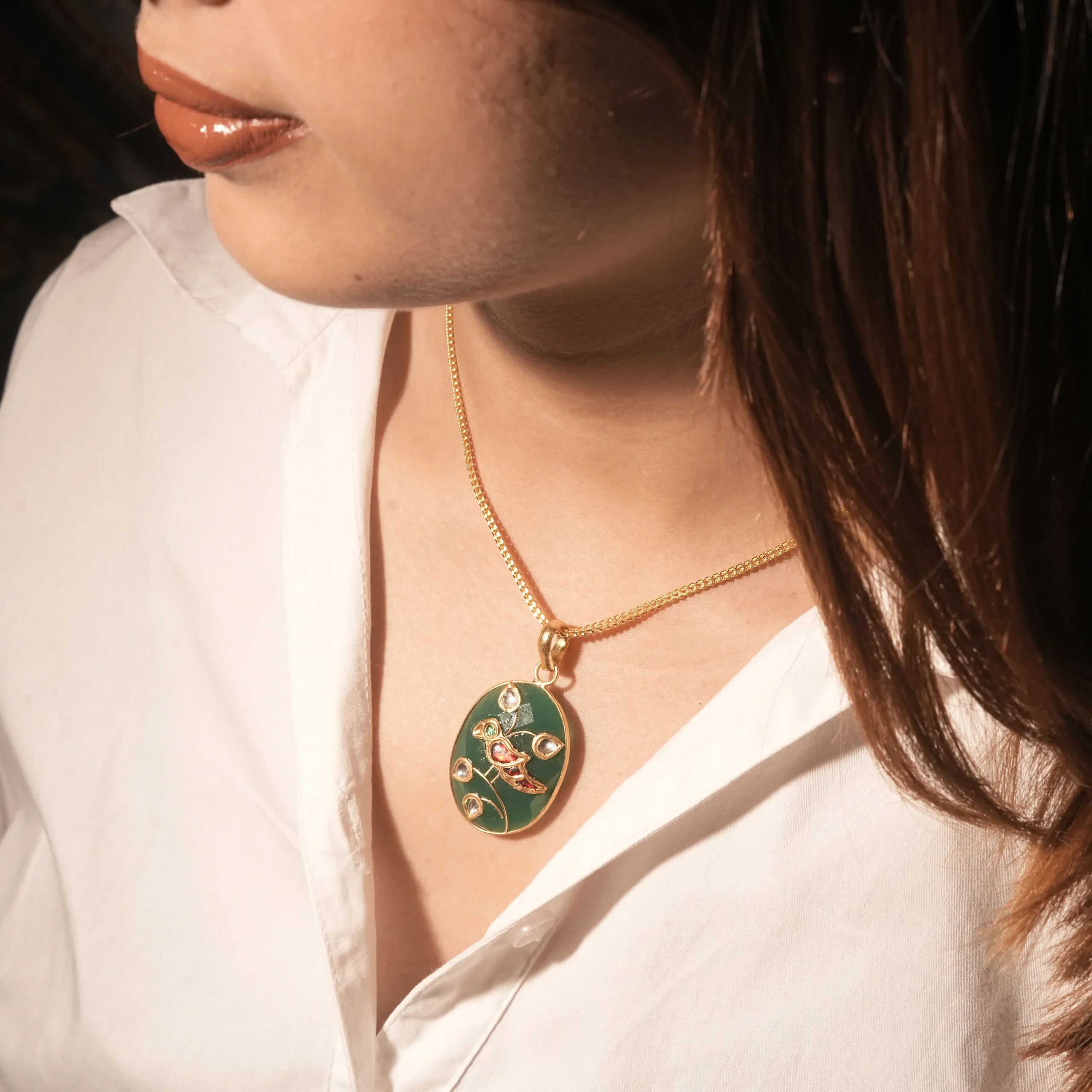 925 Silver Pendant with Meenakari Bird & Polki Leaf Motifs on Emerald Enamel