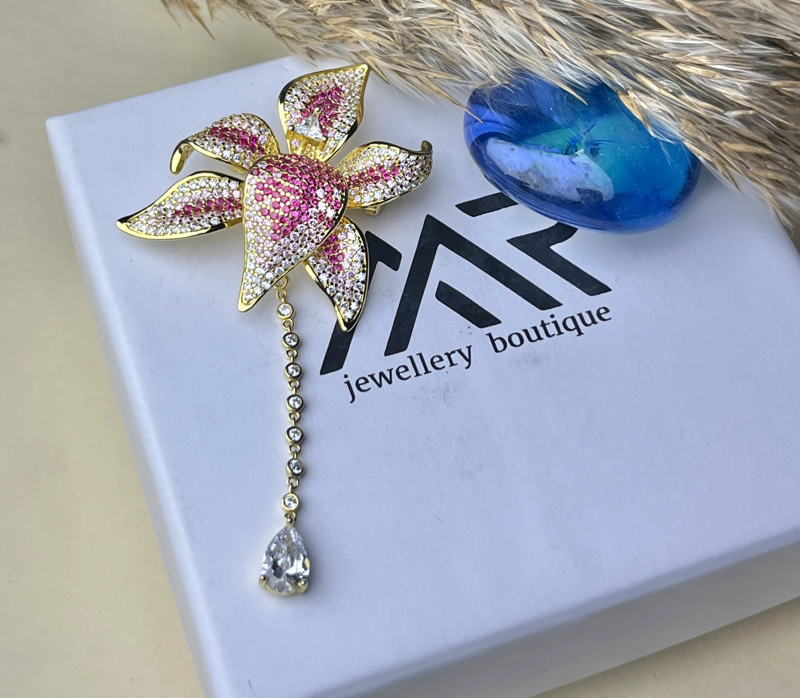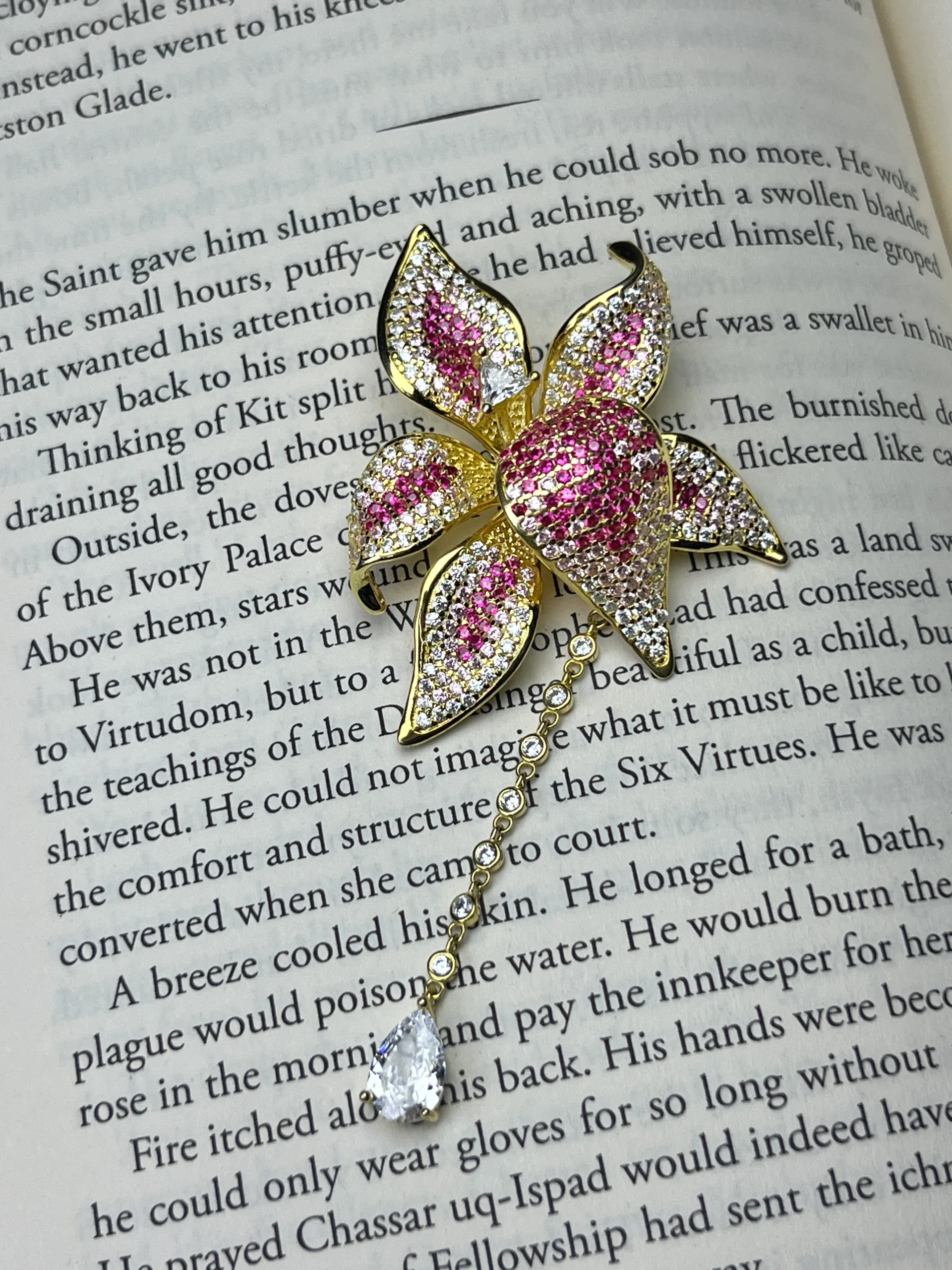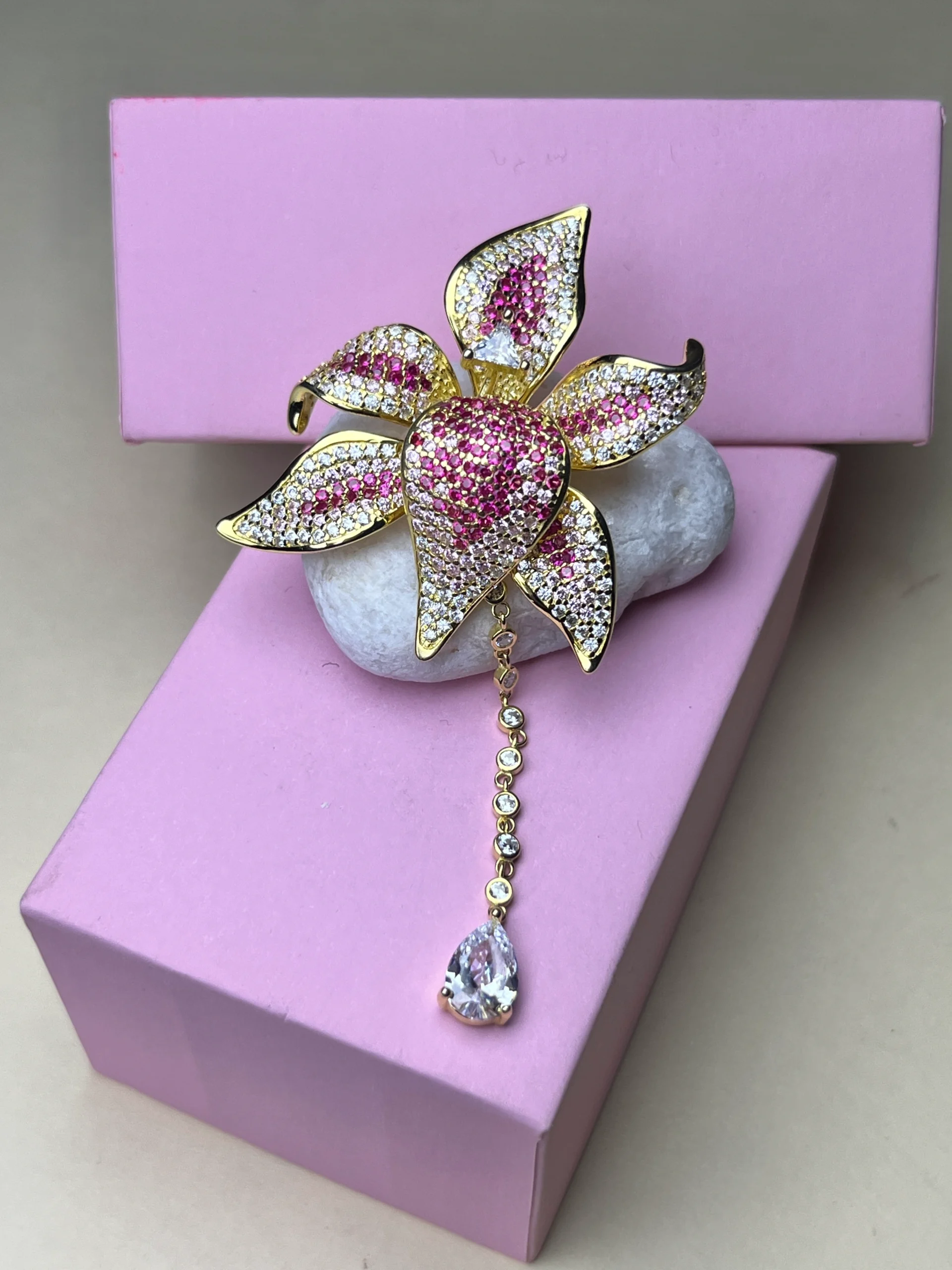 The centerpiece features a vibrant pink pavé setting, surrounded by delicately shaped petals encrusted with shimmering stones. A graceful chain dangle with round zircon accents and a pear-cut drop stone enhances the overall elegance, adding movement and brilliance to the design.