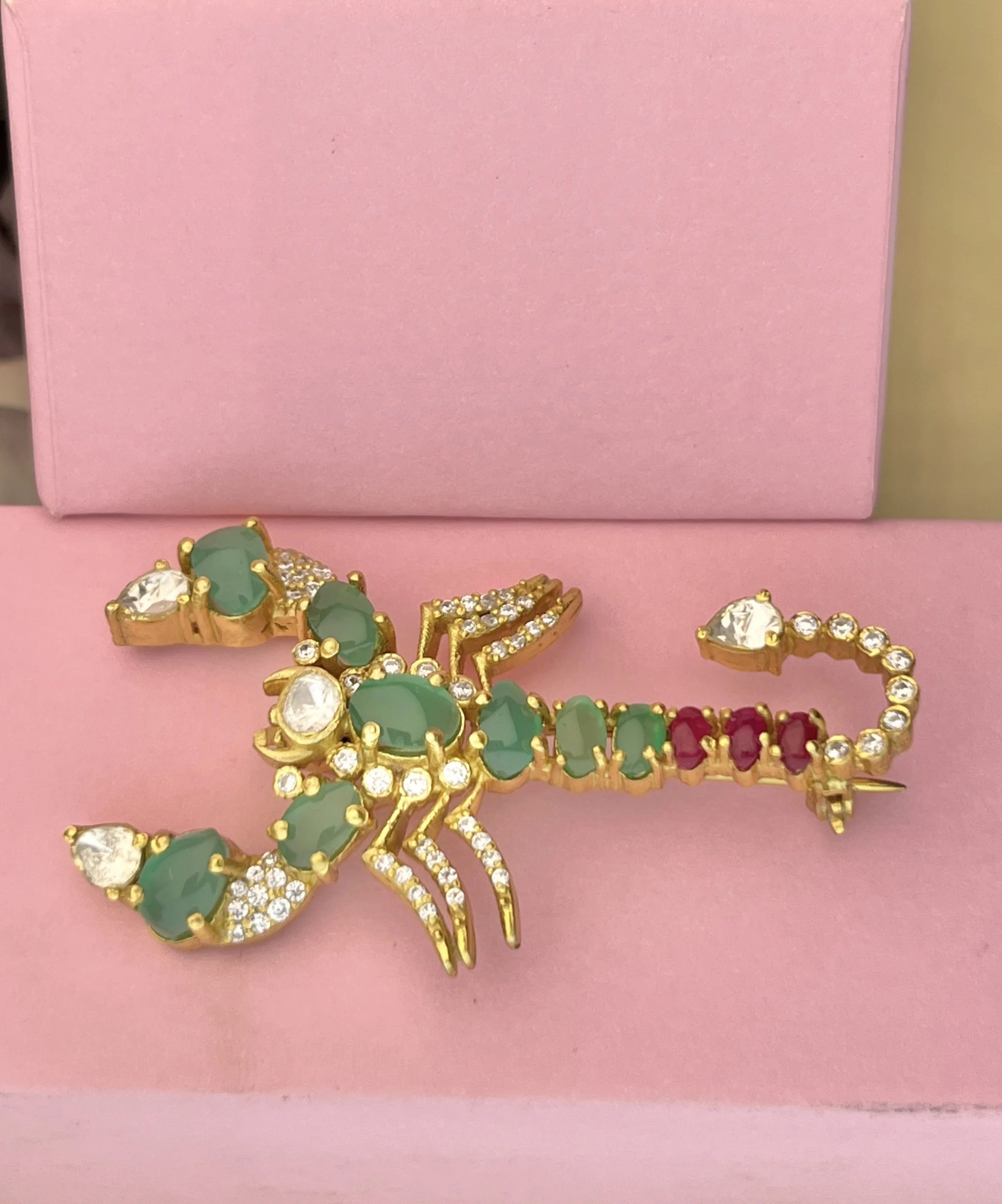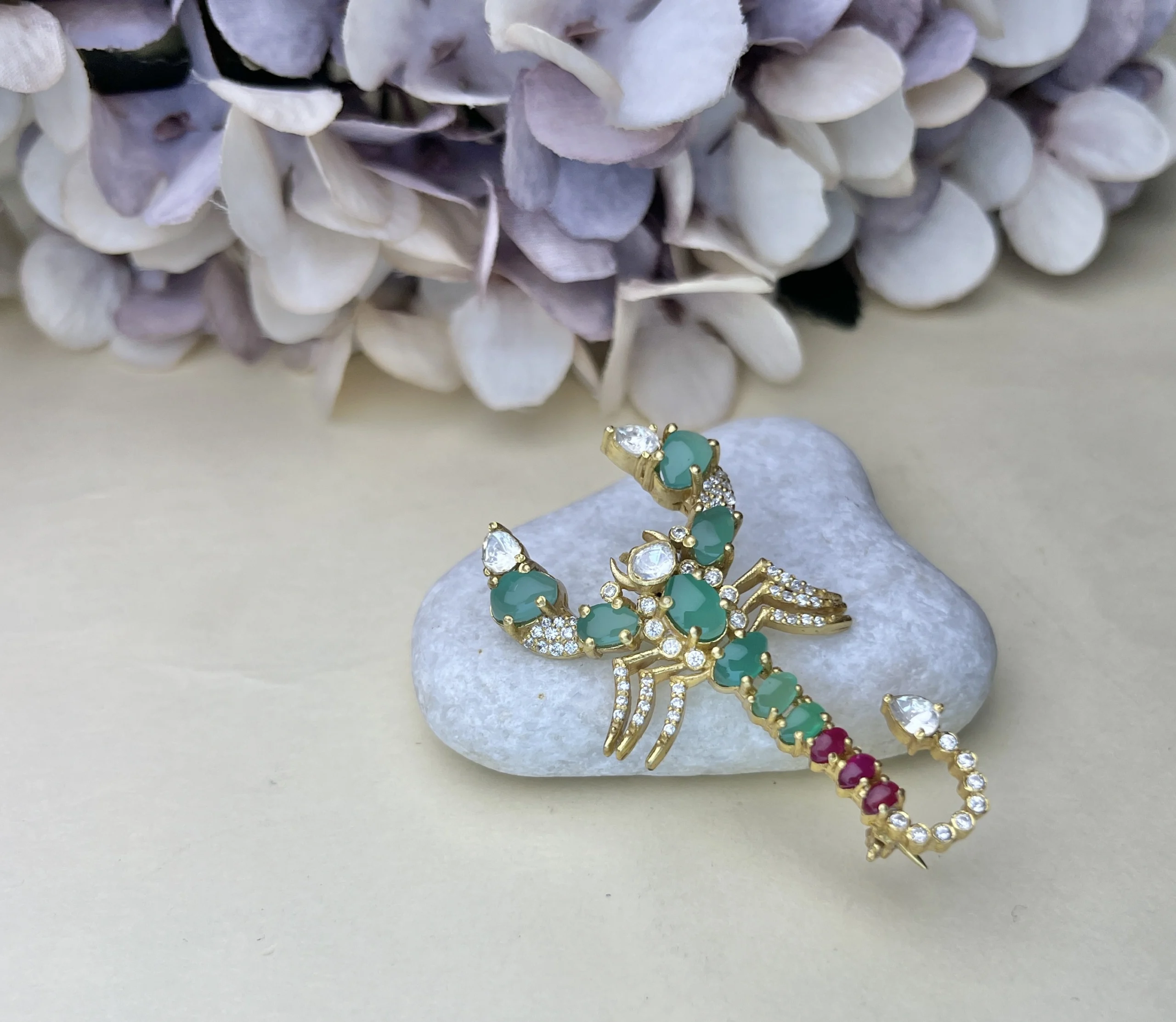 Crafted from premium 925 sterling silver and finished with luxurious gold plating, the brooch features finely detailed claws, body segments, and tail curves, creating a lifelike and elegant appearance. The combination of rich green stones, deep red accents, and shimmering white crystals gives this piece a royal and eye-catching appeal.