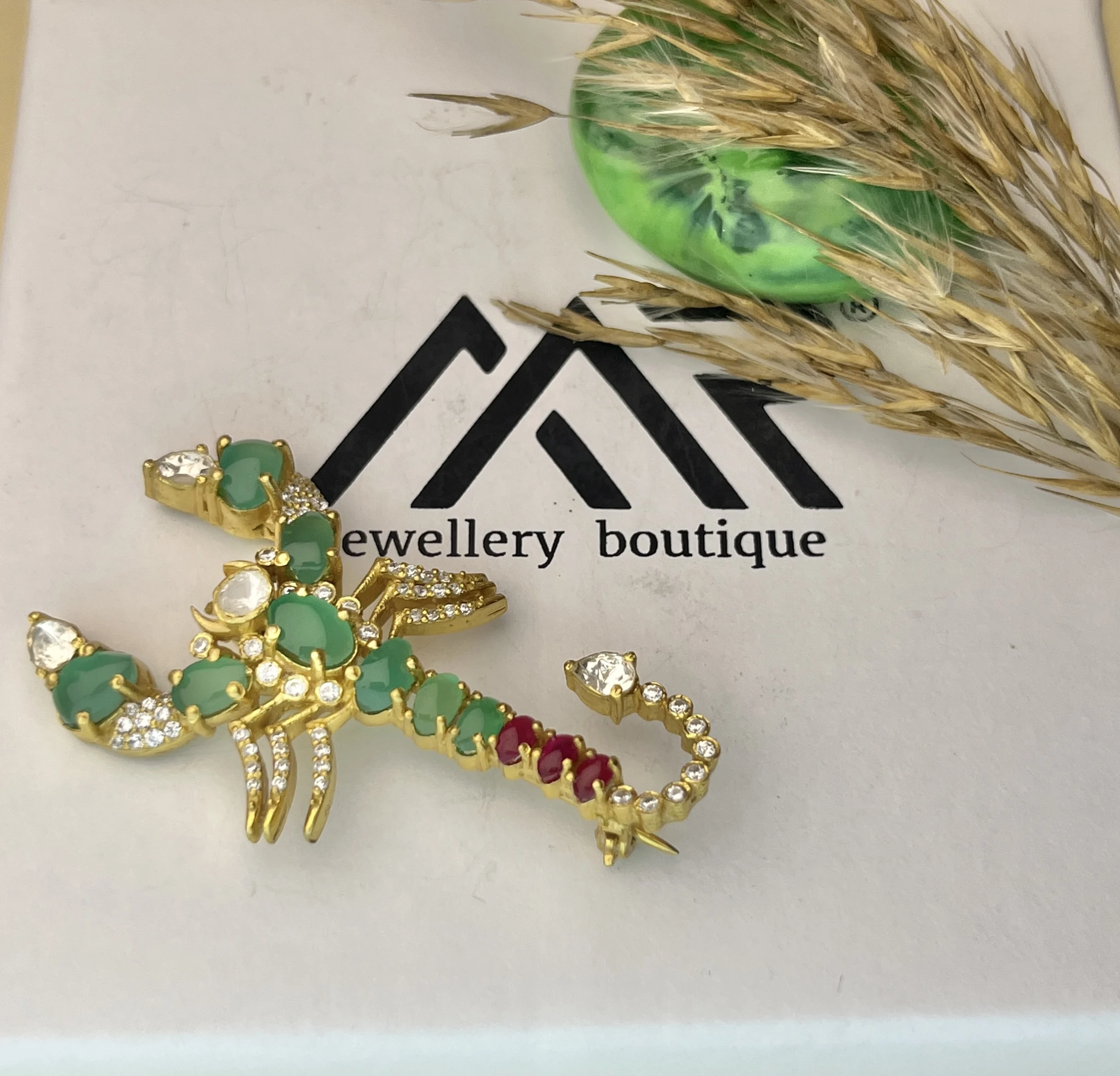 Make a bold and artistic statement with this striking 925 Sterling Silver Scorpion Brooch, beautifully crafted to reflect power, confidence, and unique style. Designed in an intricate scorpion motif, this brooch is adorned with vibrant green and ruby-colored cubic zirconia stones, accented with sparkling clear CZ detailing for added brilliance.