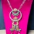 Accented with vibrant green enamel detailing, deep ruby-red stone drops, and delicate pearl hangings, this necklace reflects royal elegance and spiritual artistry. The double-strand pearl-style chain enhances its classic appeal, making it a perfect choice for weddings, festive occasions, classical dance performances, and heritage celebrations.