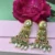 The design flows into intricate gold detailing adorned with green bead clusters, ruby-tone square stones, and graceful freshwater pearl drops that create elegant movement with every step. The layered structure and fine craftsmanship make these earrings a statement choice for weddings, festive celebrations, and special occasions.