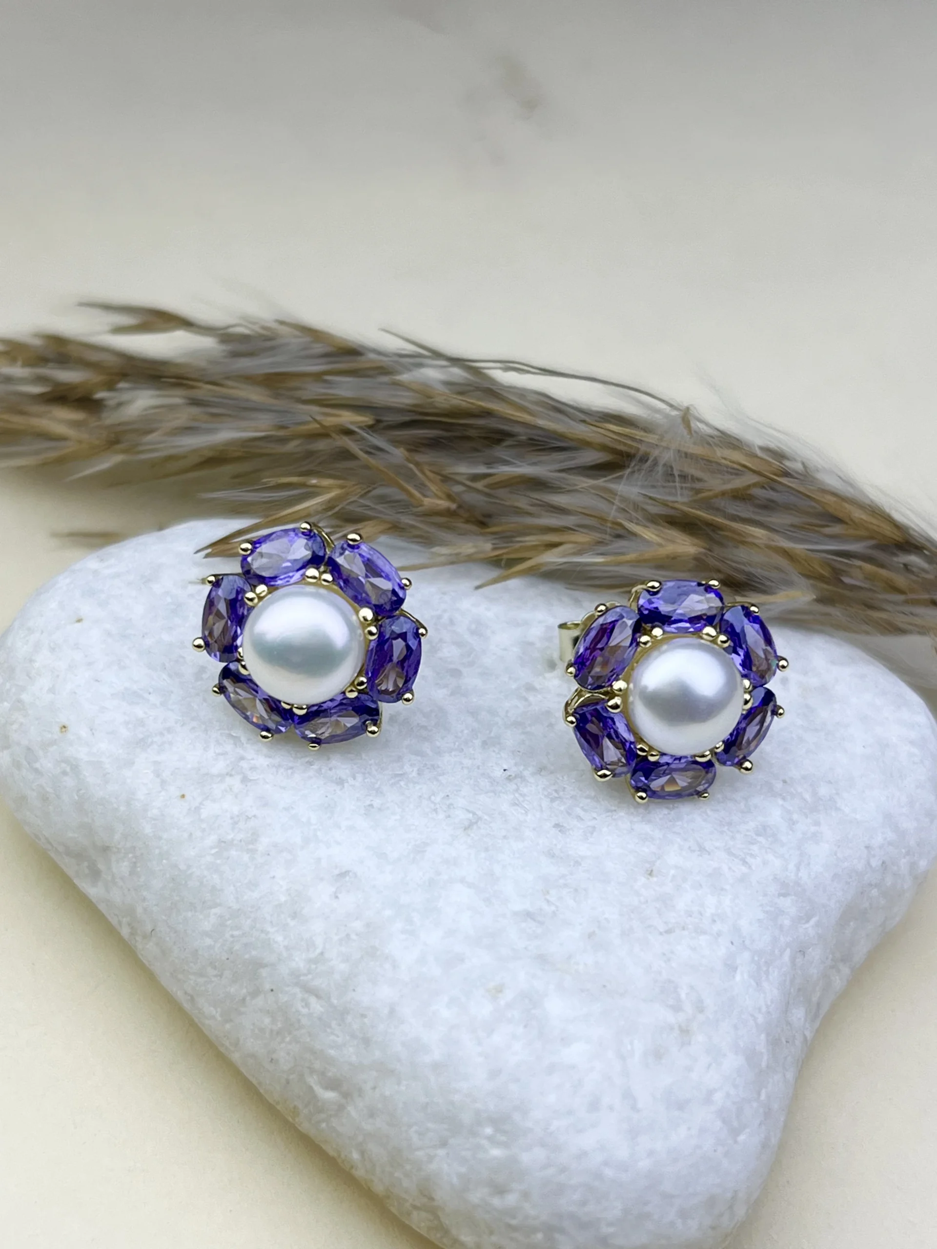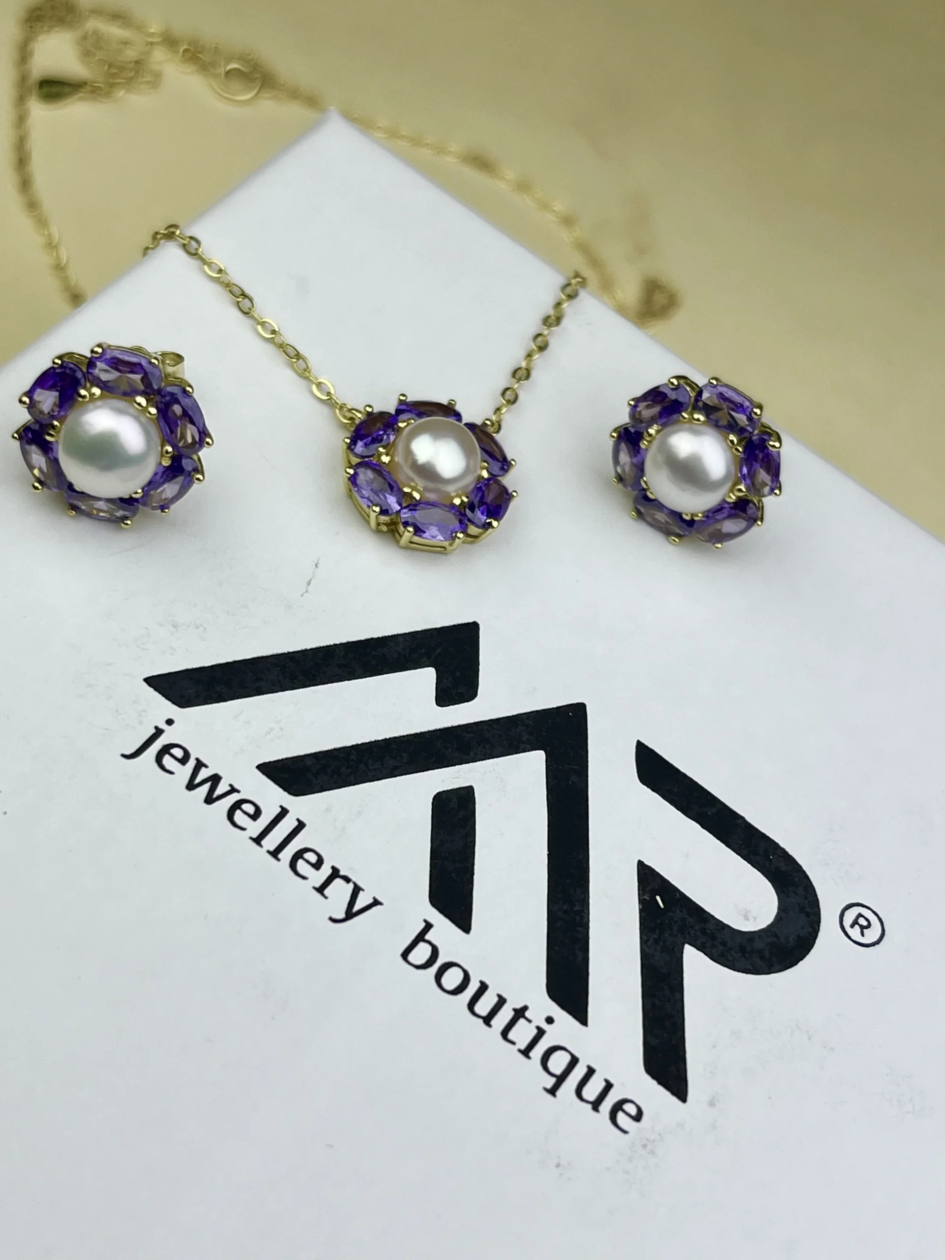 925 Sterling Silver Pearl & Purple Stone Floral Pendant Set with Stud Earrings
