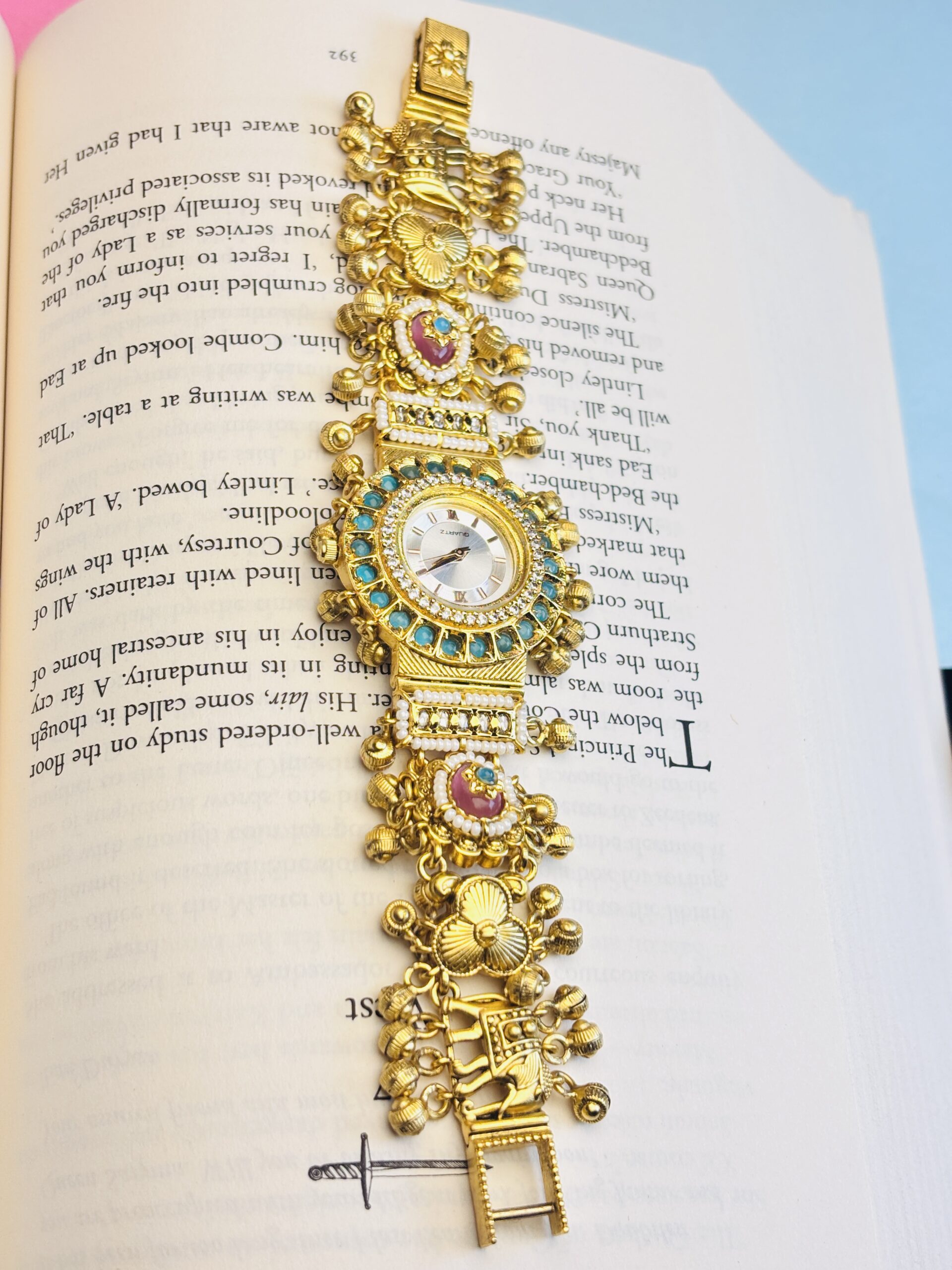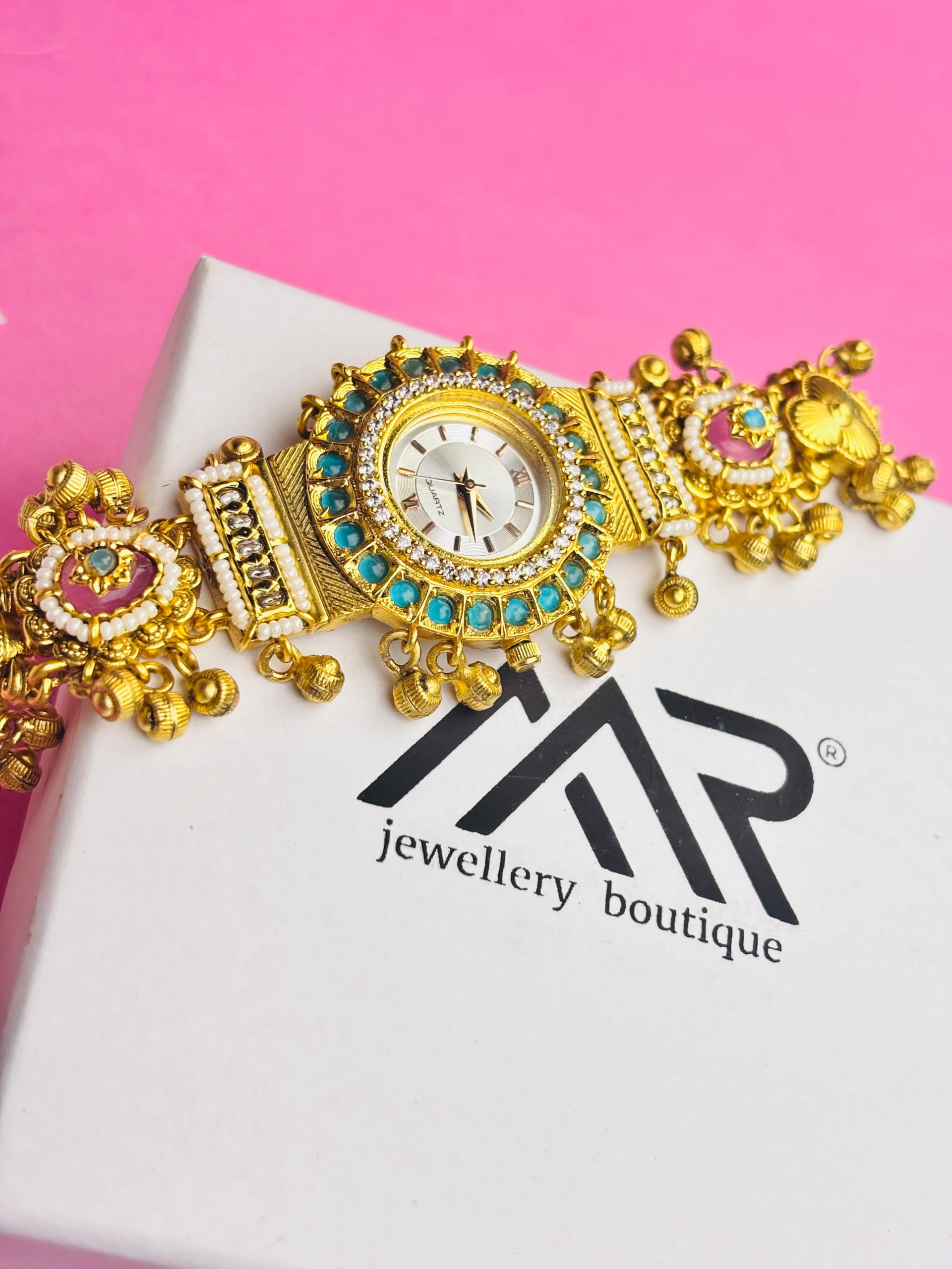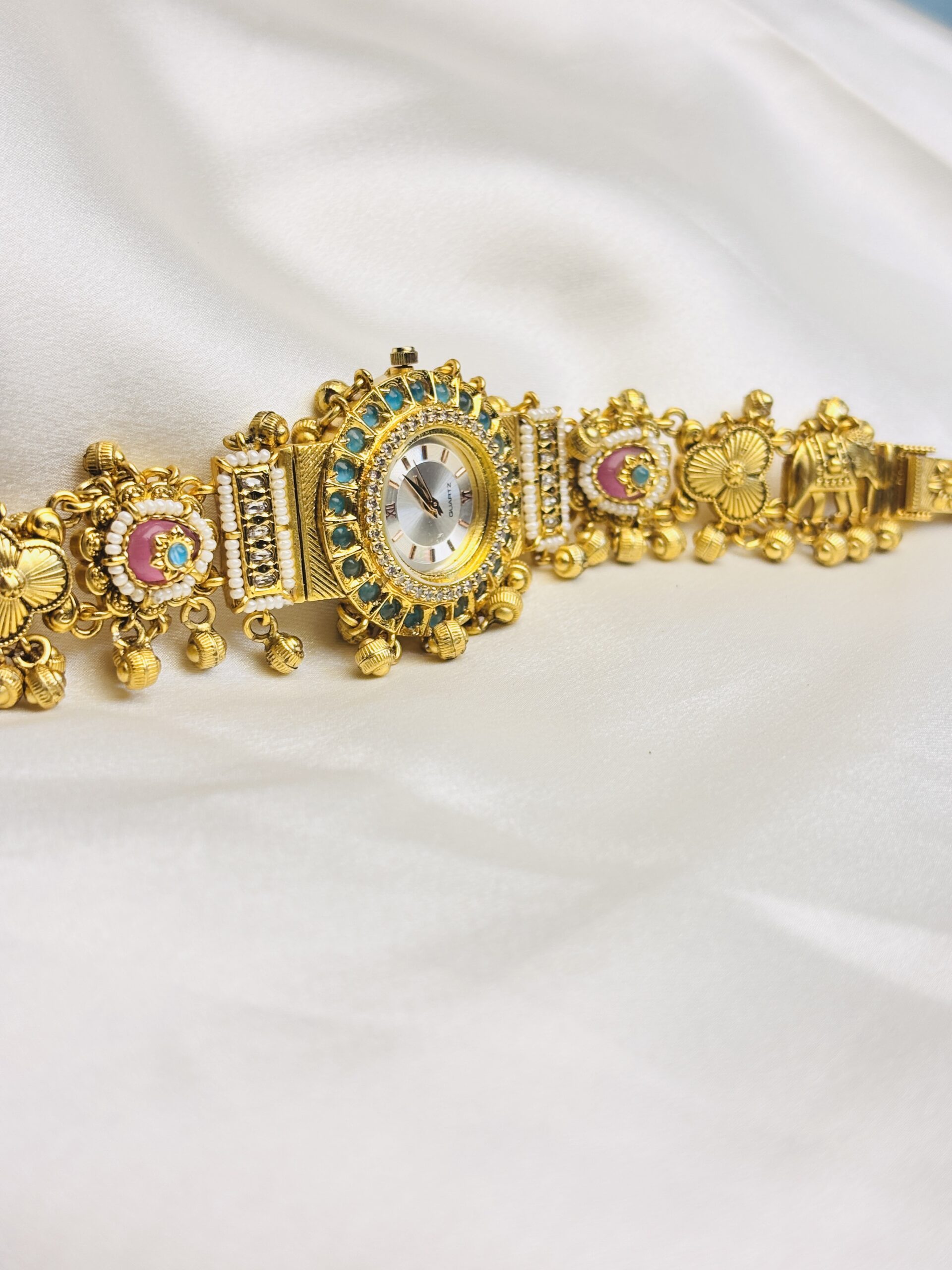 The design features a round watch dial surrounded by delicate turquoise-blue stones, creating a royal and captivating look. The ornamental bracelet strap is intricately adorned with engraved floral motifs, pink stone accents, and tiny bead drops, reflecting exquisite handcrafted Indian jewelry detailing. Its antique gold-plated finish enhances its vintage charm, making it a standout ethnic silver accessory for every occasion.
