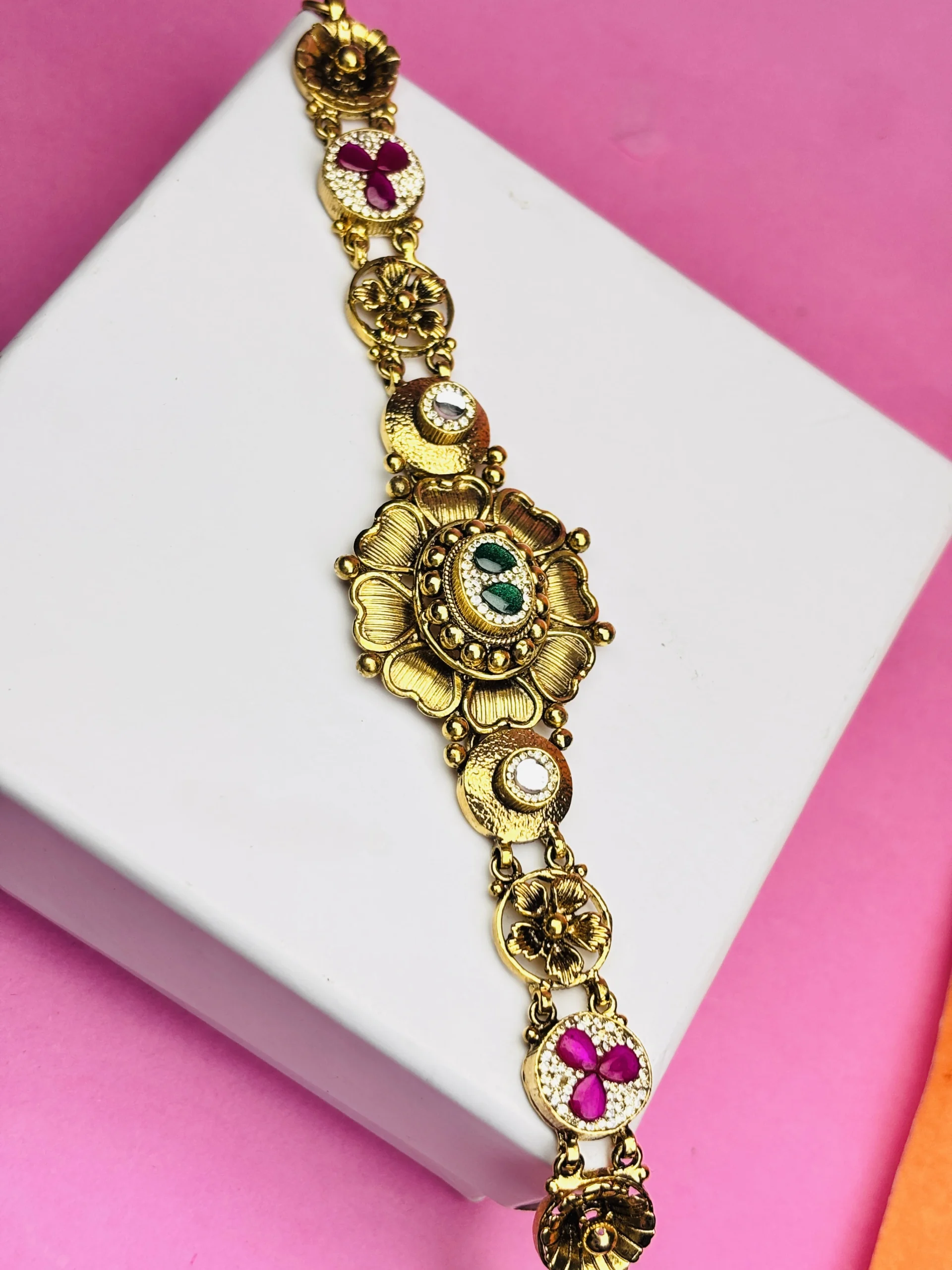 The alternating flower and gemstone patterns highlight fine artistry and add a vibrant touch to your ensemble. Perfect for festive occasions, weddings, and traditional gatherings, this bracelet complements both Indian and Indo-western attire beautifully.