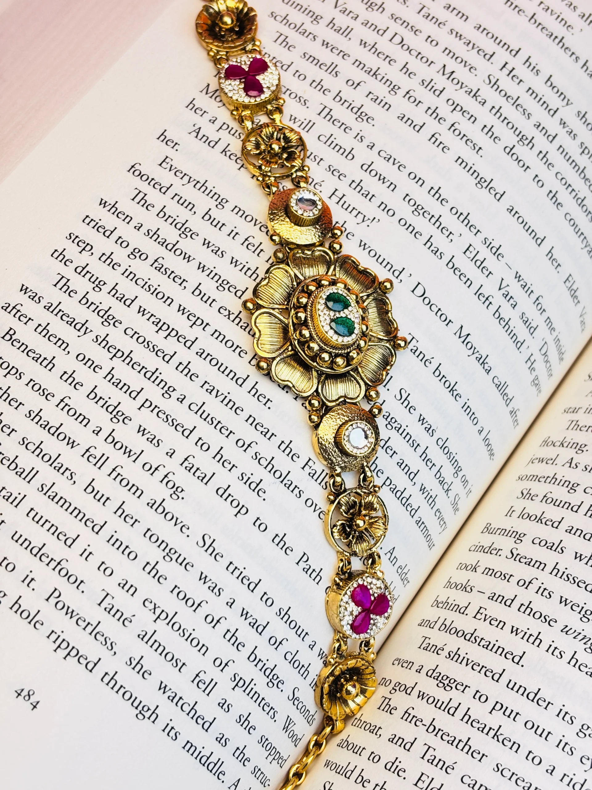 Elevate your ethnic charm with this exquisite Antique Silver Bracelet, artistically crafted to reflect timeless beauty and intricate craftsmanship. The bracelet features a stunning floral motif centerpiece, embellished with emerald-green and ruby-red gemstones, symbolizing elegance and tradition. Each element is delicately designed with ornate textures and circular floral accents, creating a regal and vintage appeal.