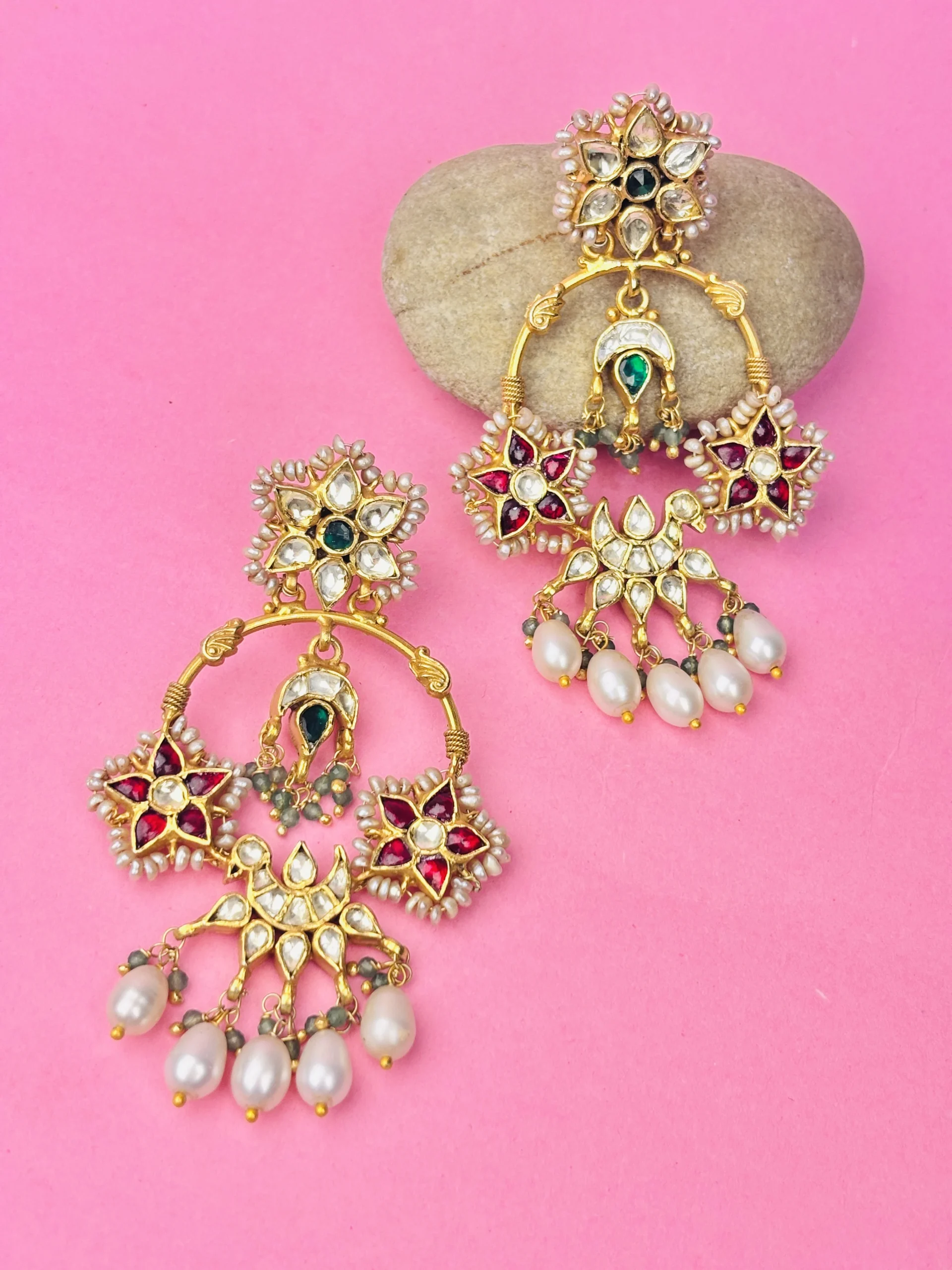 The top floral stud, adorned with green kundan accents, flows gracefully into a beautifully detailed hoop structure. Intricate star-shaped kundan motifs in red and white enhance their regal charm, while delicate pearl drops and green stone beads add a graceful finish.