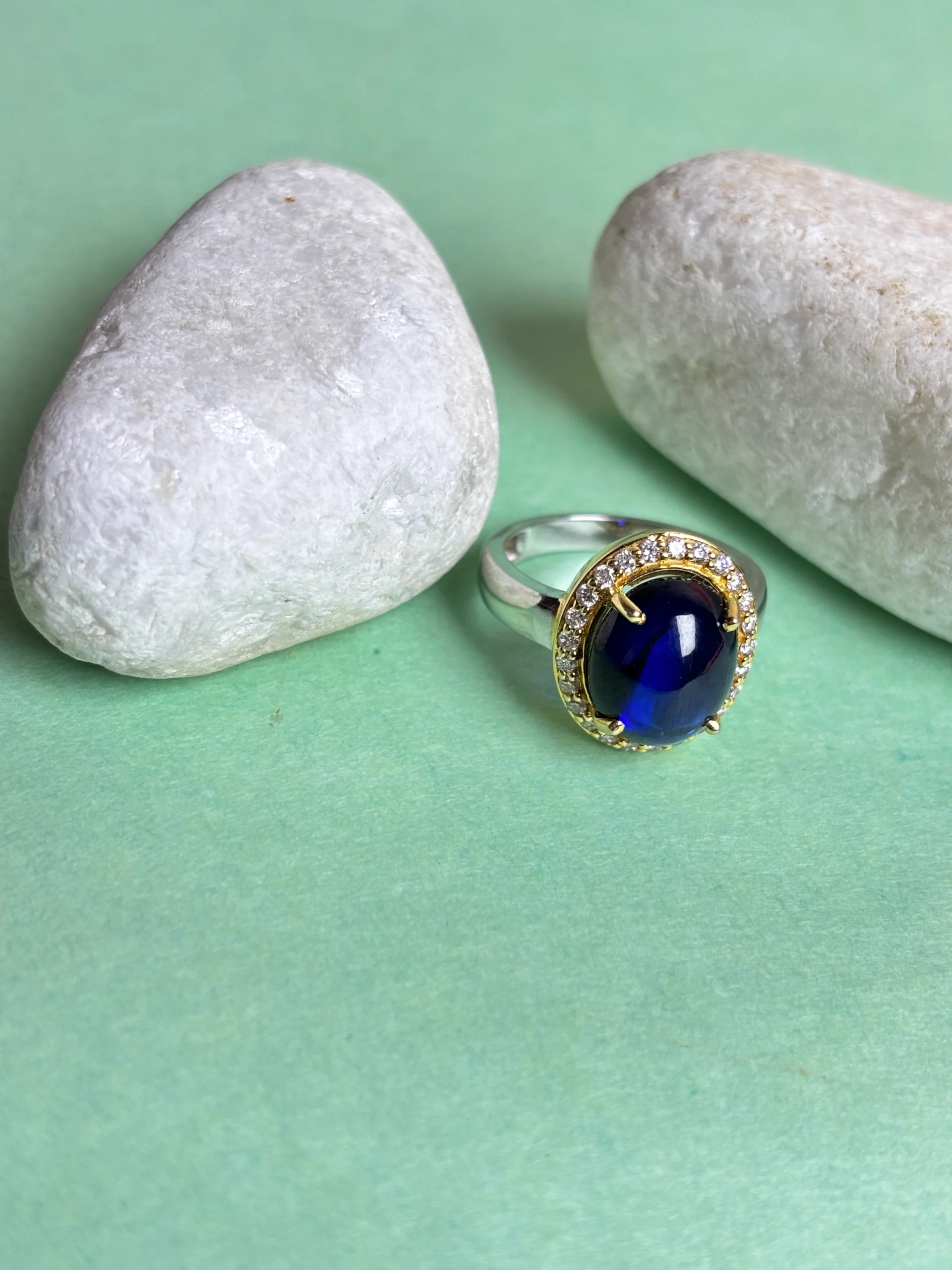 Centerpiece Gemstone: Oval-cut Blue Sapphire (Cabochon)