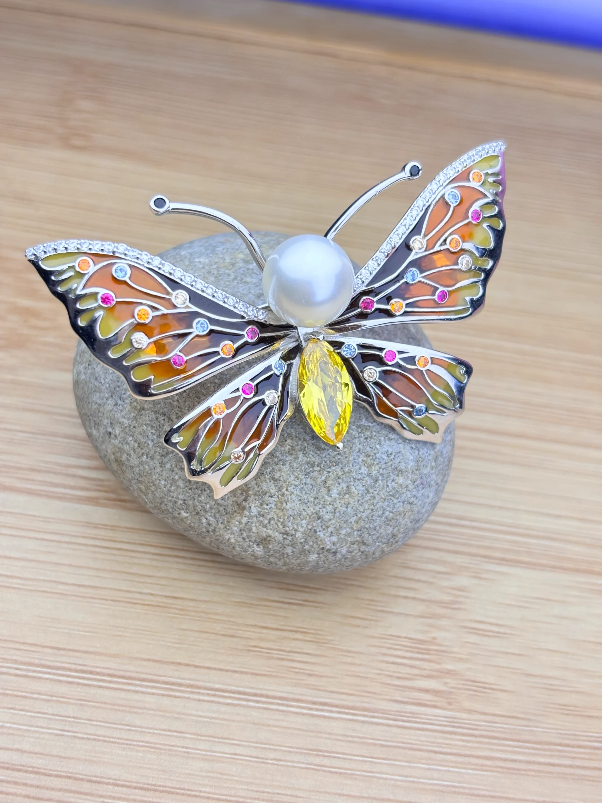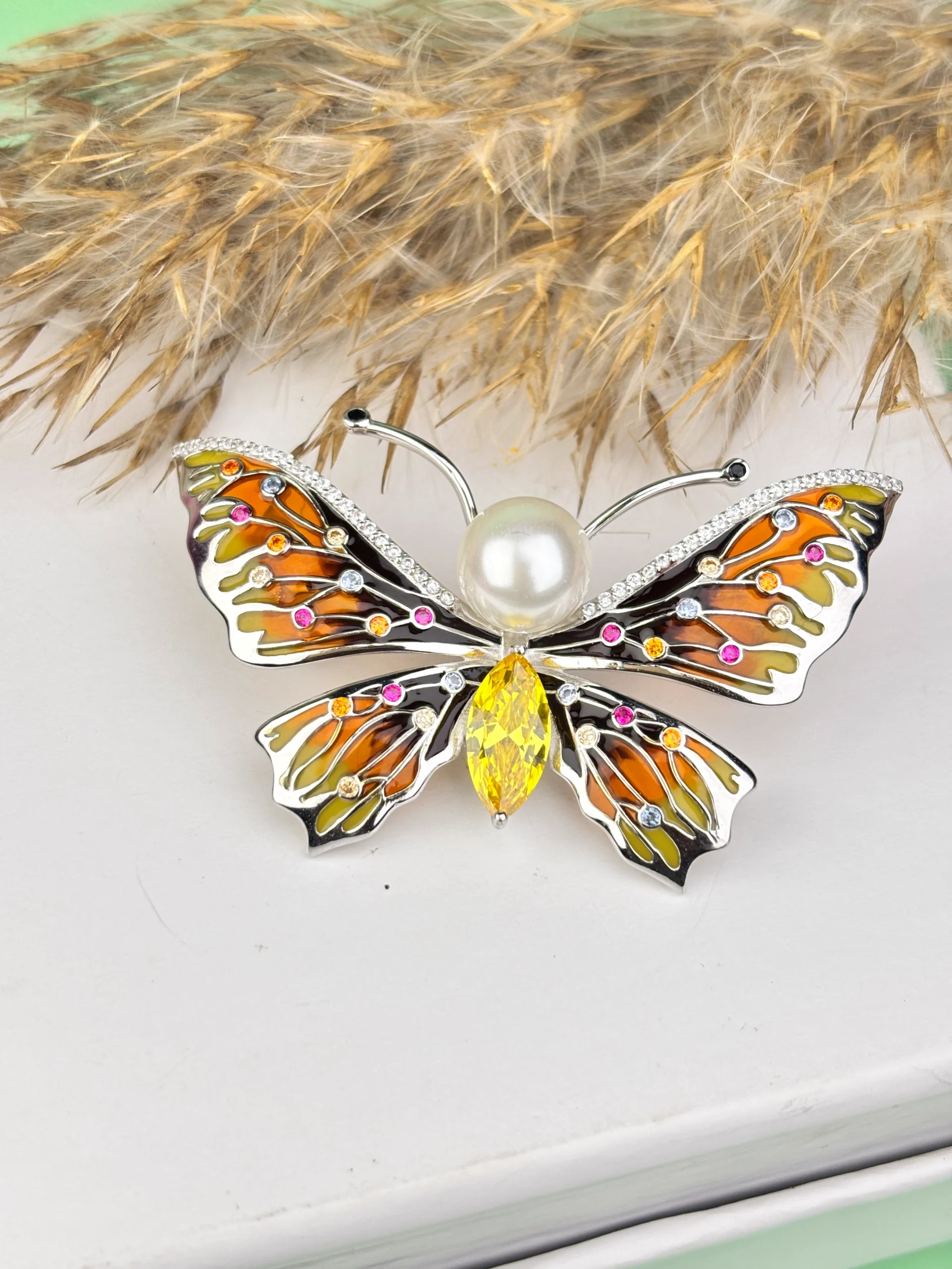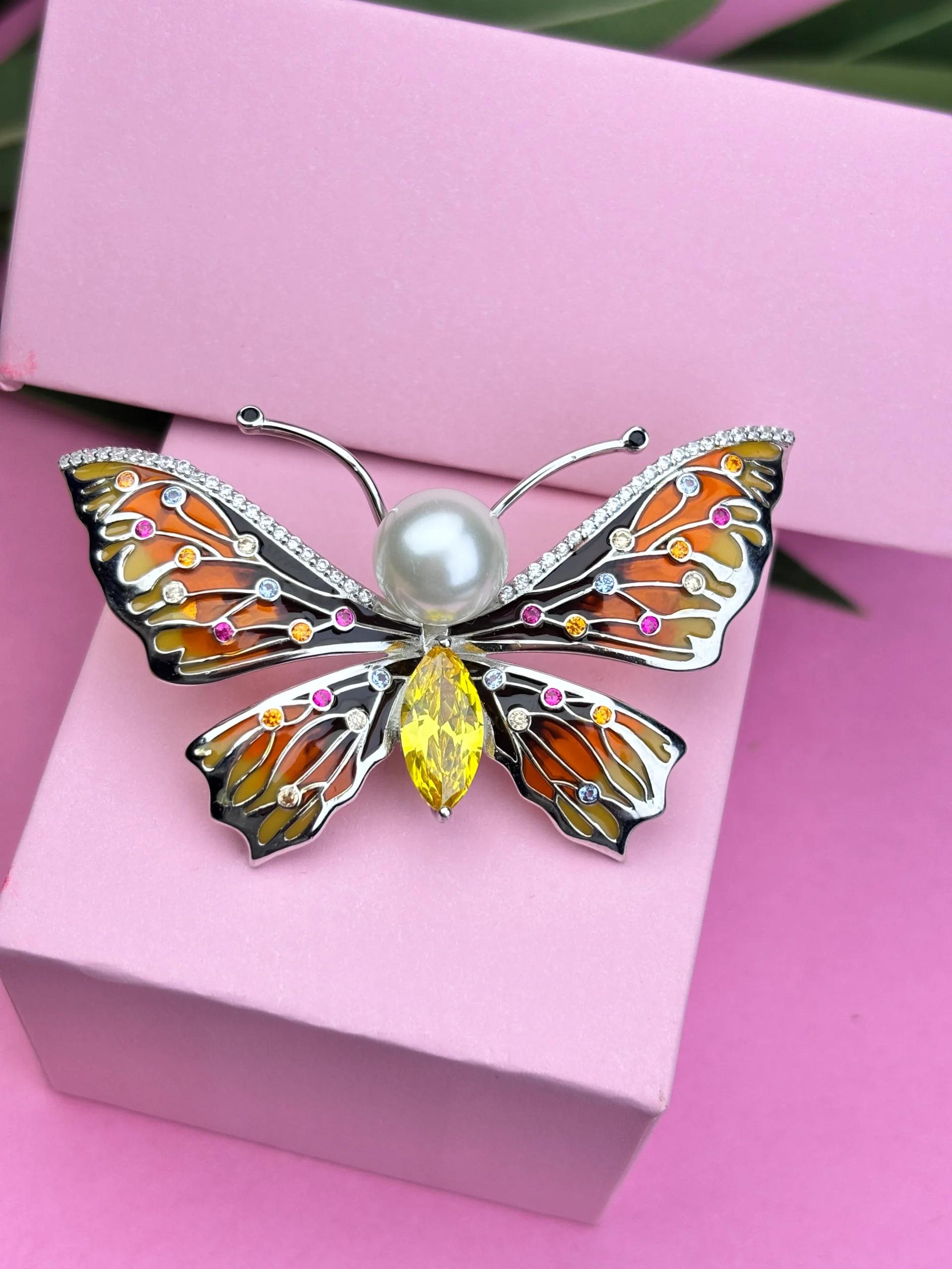 Gemstones: Multicolor gemstones (pink, yellow, orange, white) for vibrant appealCenterpiece: Luminous pearl forming the butterfly’s body
