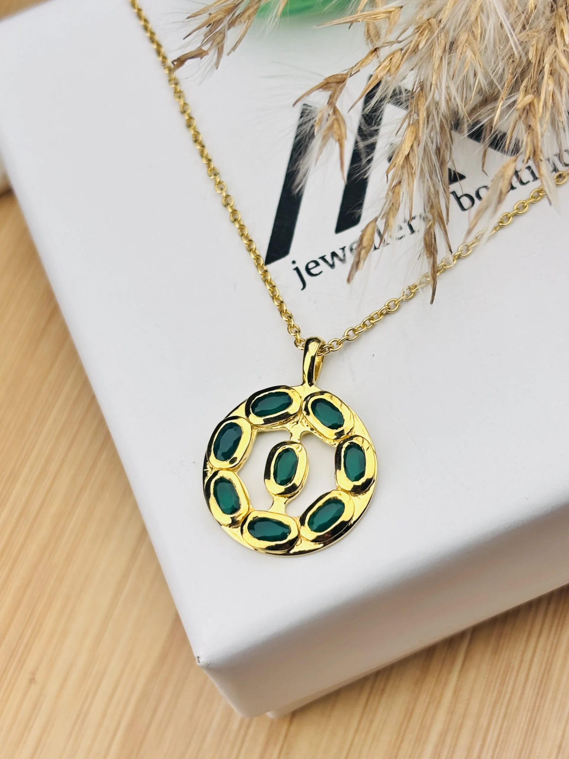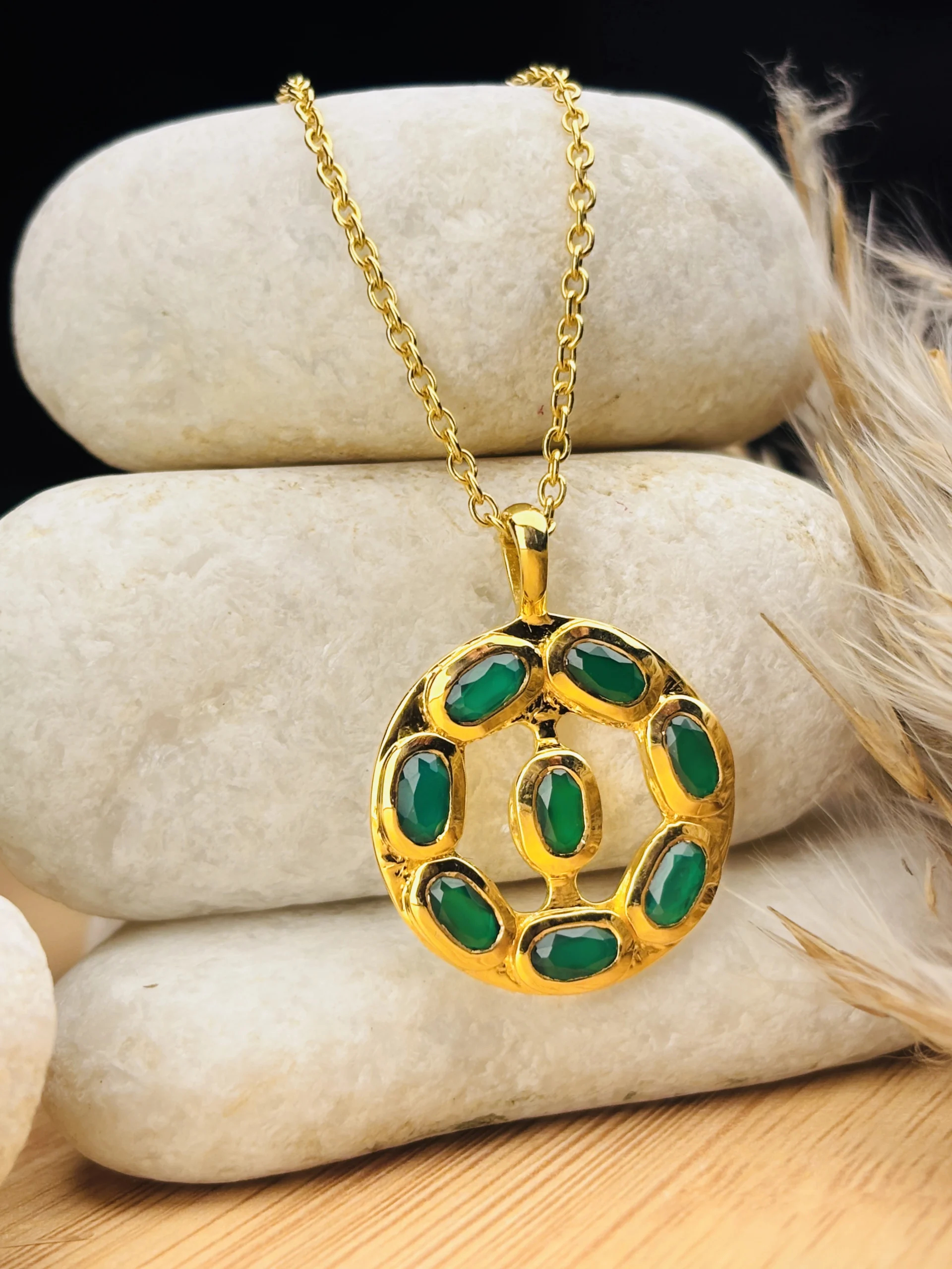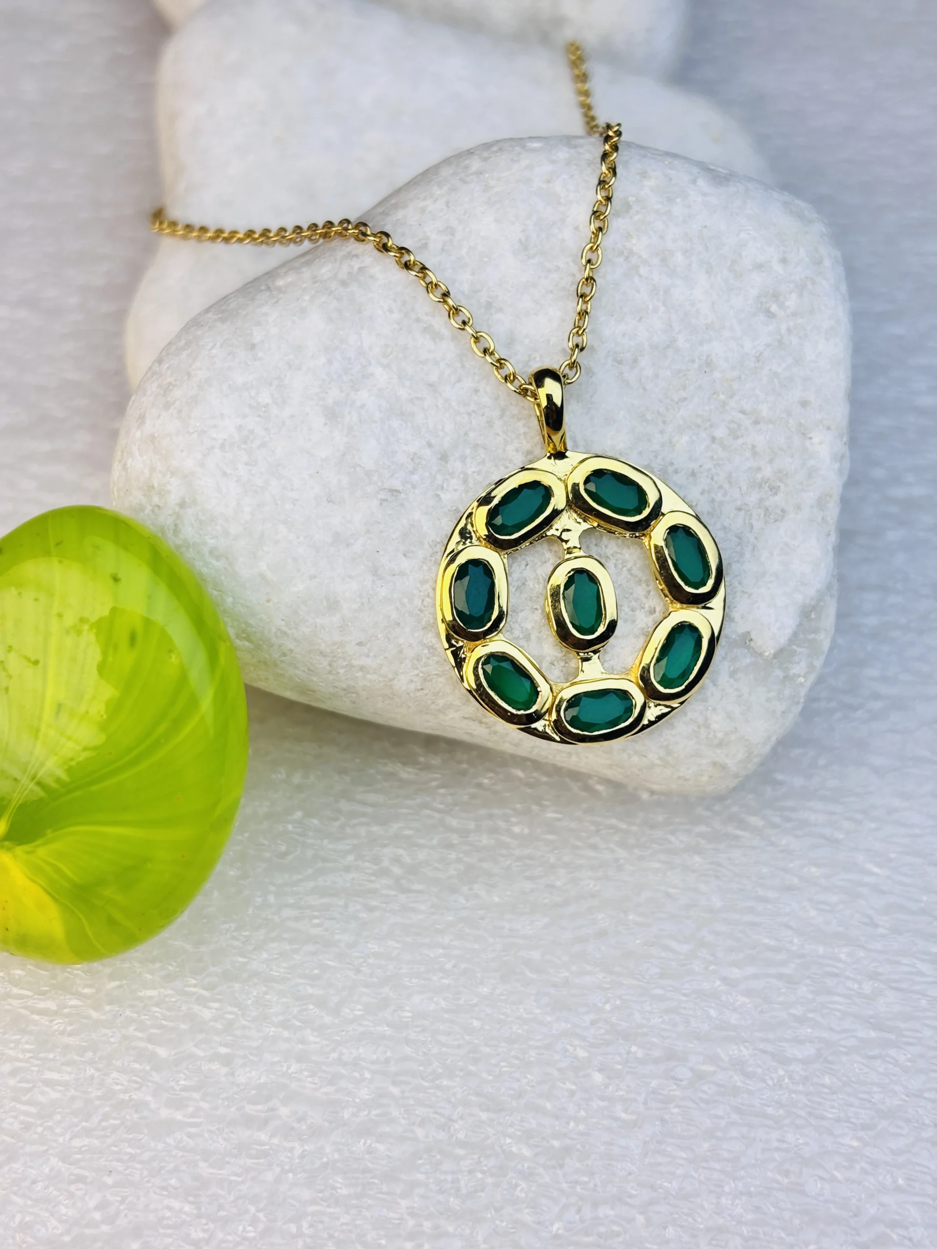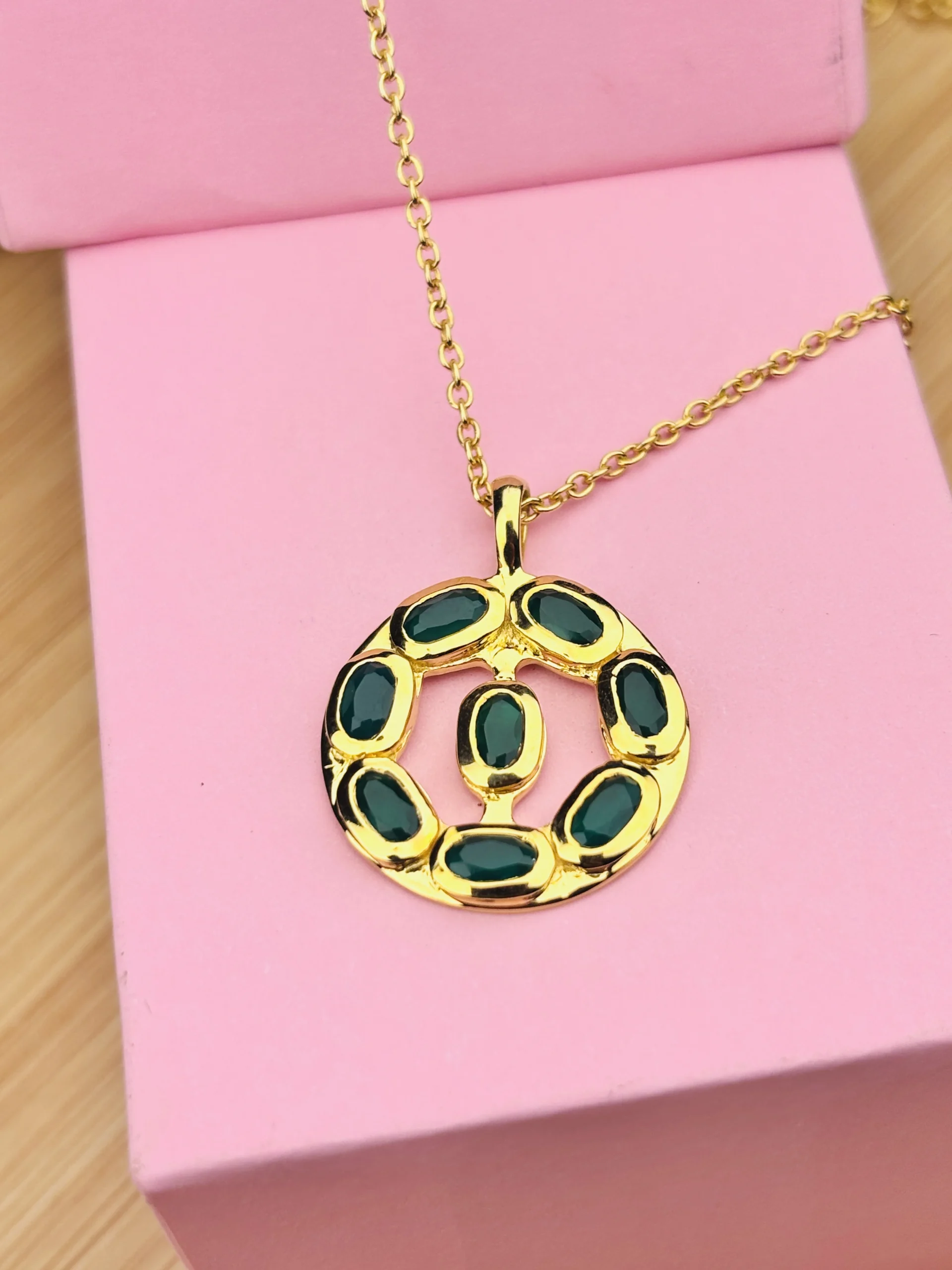 Elevate your everyday elegance with this beautifully crafted 925 sterling silver pendant necklace, designed to bring a perfect balance of luxury and charm. The round pendant features a unique artistic pattern set with multiple emerald-green oval stones, each bezel-set within a smooth gold-plated frame. The rich green stones contrast stunningly with the bright gold finish, creating a bold yet refined look.