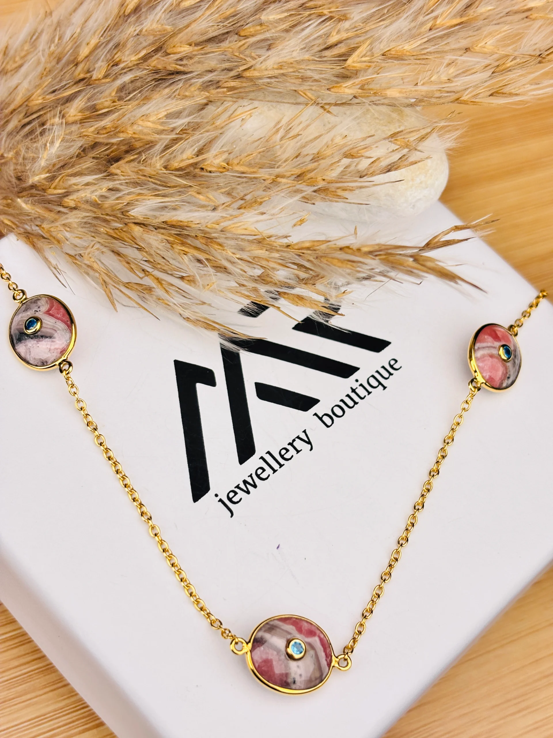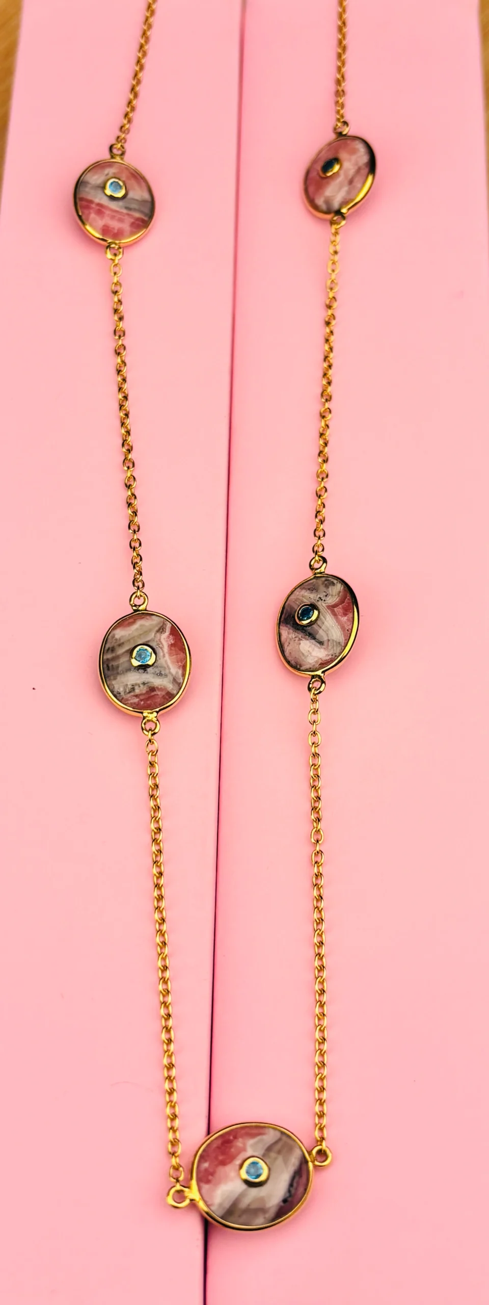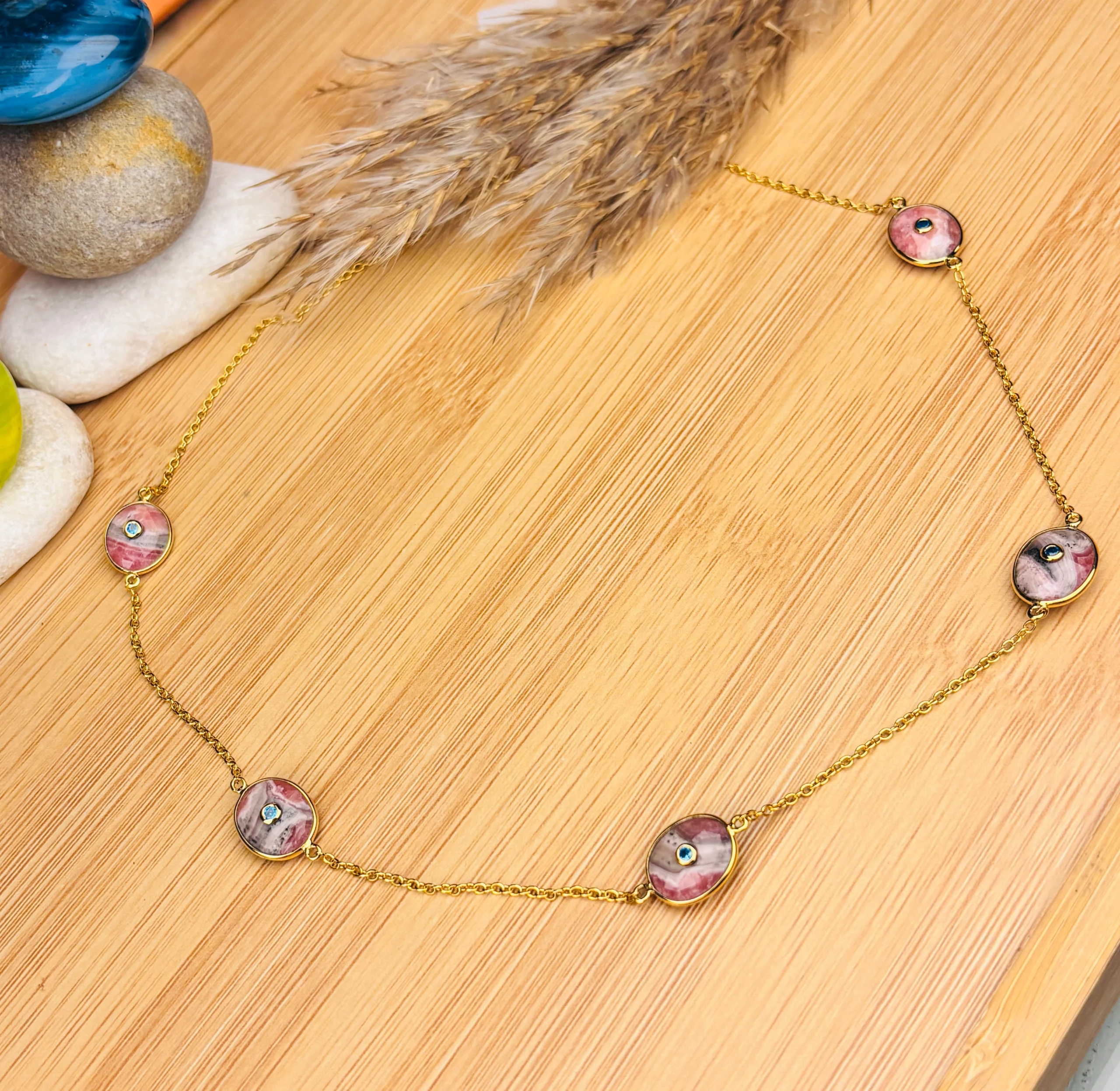 Elevate your everyday style with this beautifully handcrafted oval gemstone station necklace, designed to add a soft pop of color and timeless elegance to any outfit. The necklace features five polished oval cabochon stones in natural shades of rose, blush, and charcoal, each uniquely patterned for a one-of-a-kind look.