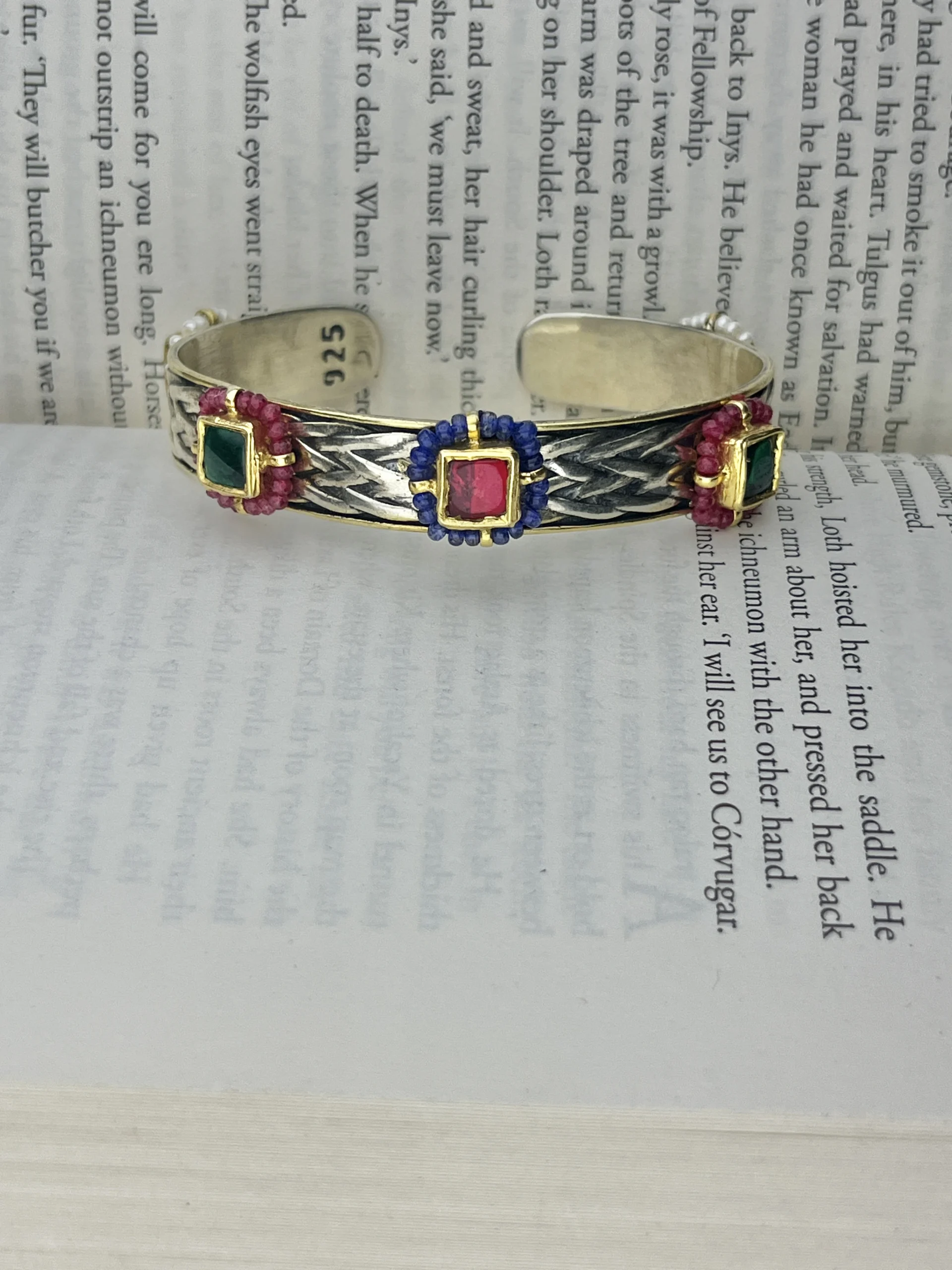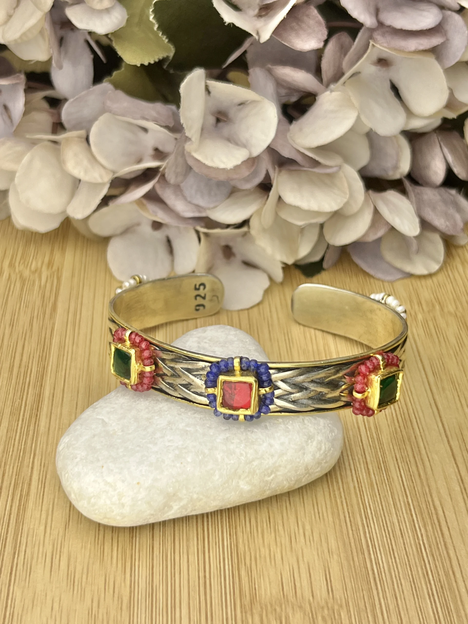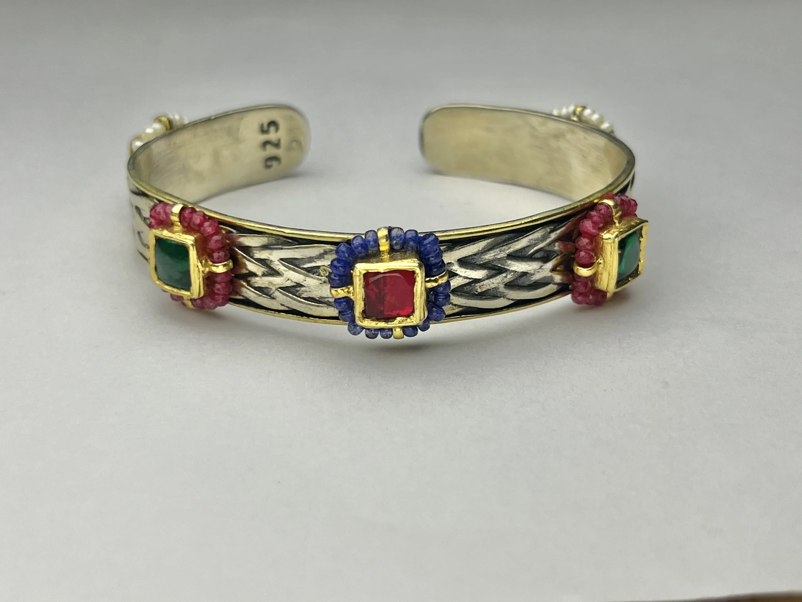 Handcrafted 925 Sterling Silver Dual-Tone Multi-Stone Cuff Bracelet