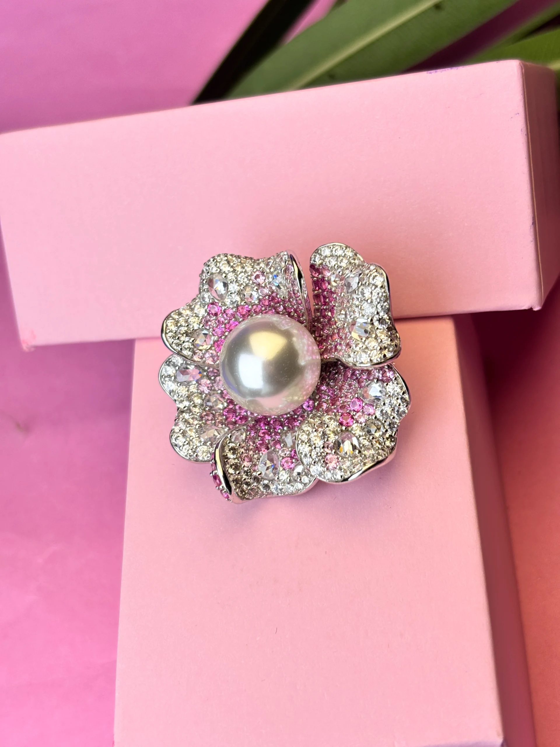 Luxury Silver Flower Brooch with Pearl & Pink-White Gemstones