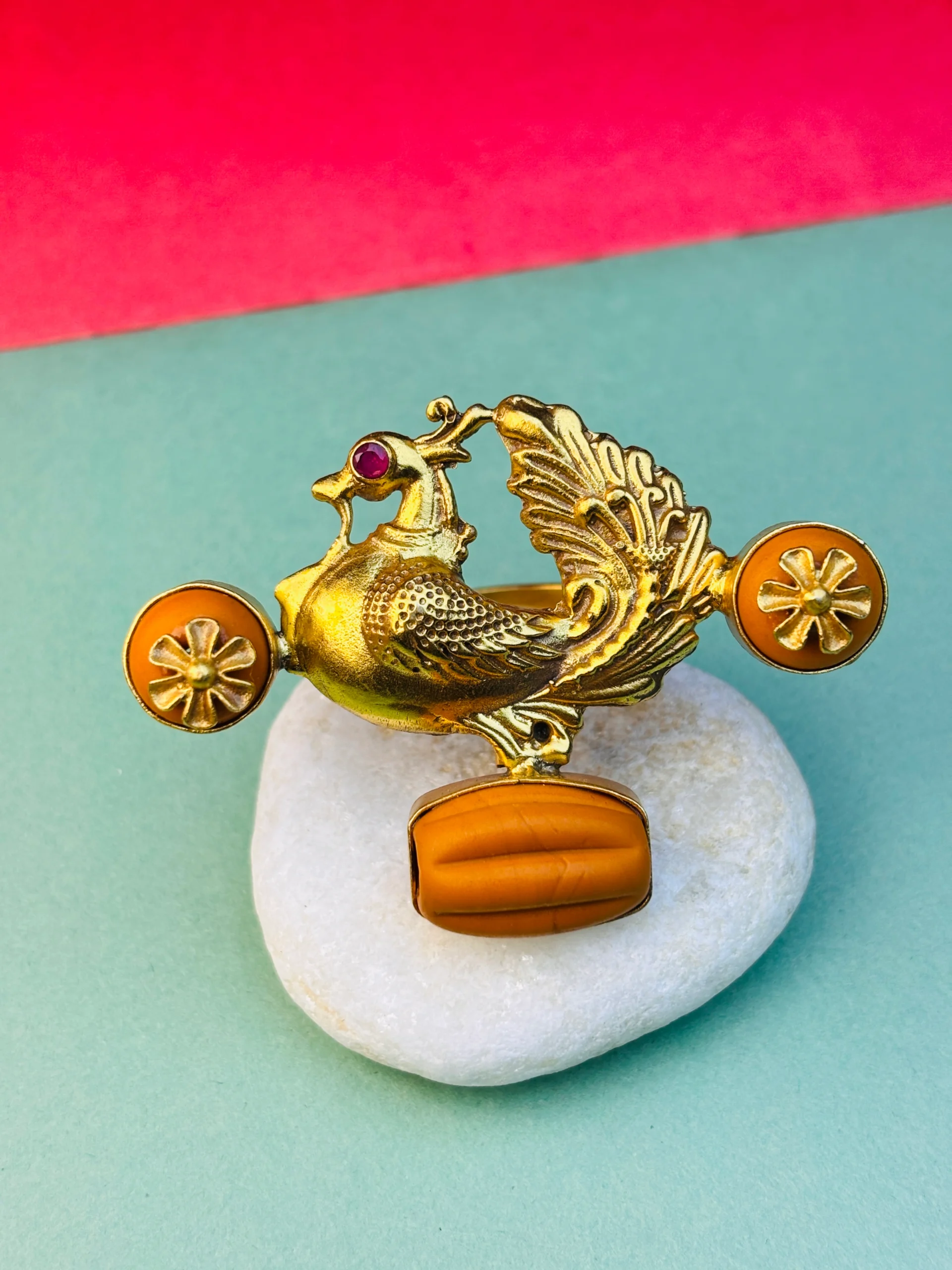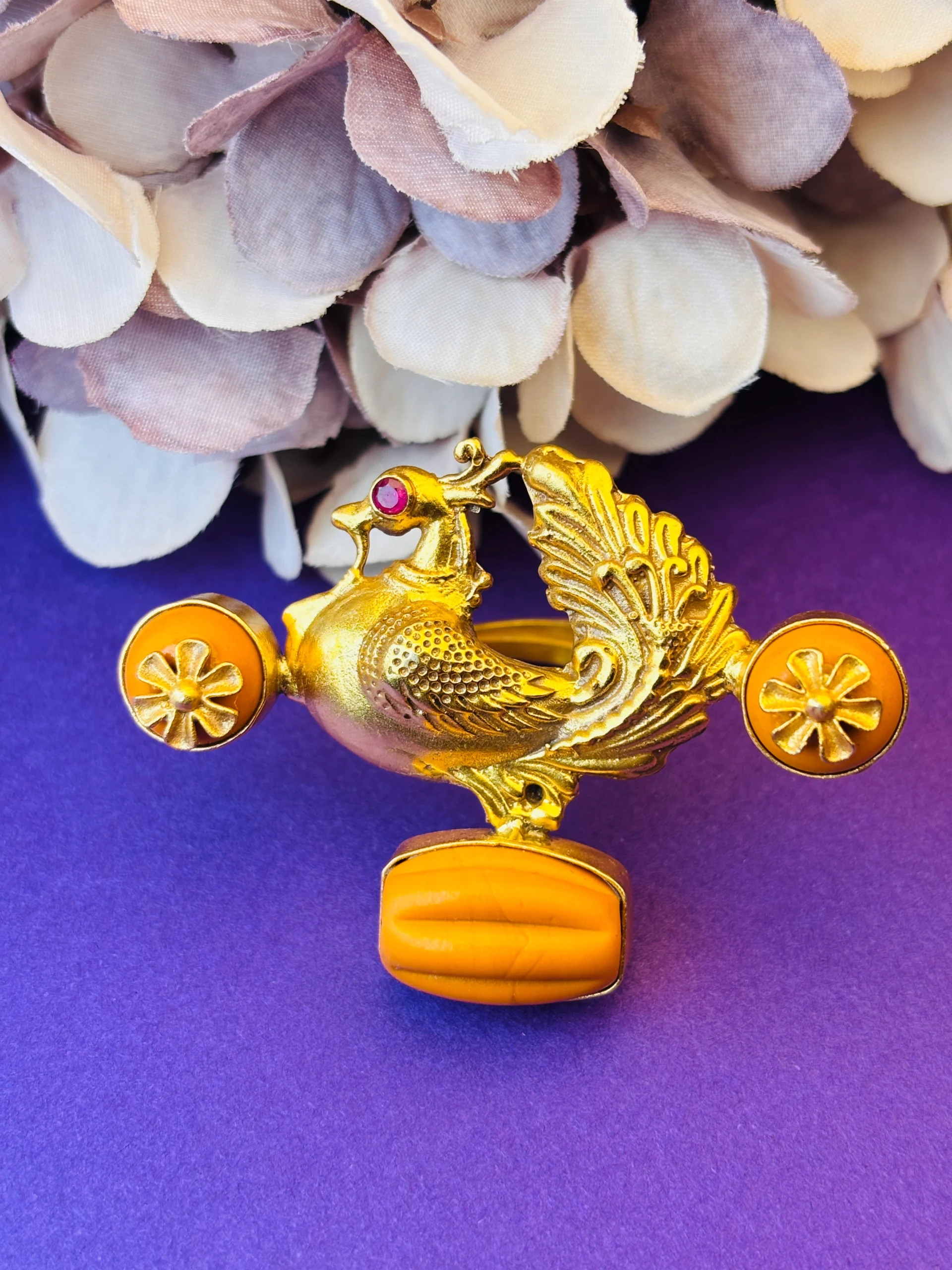 The design is further enhanced with warm amber-toned stone accents on either side, giving the ring balance, depth, and a bold statement appeal. Every curve and texture reflects fine craftsmanship, making this ring a standout piece for lovers of heritage and temple-inspired jewellery.