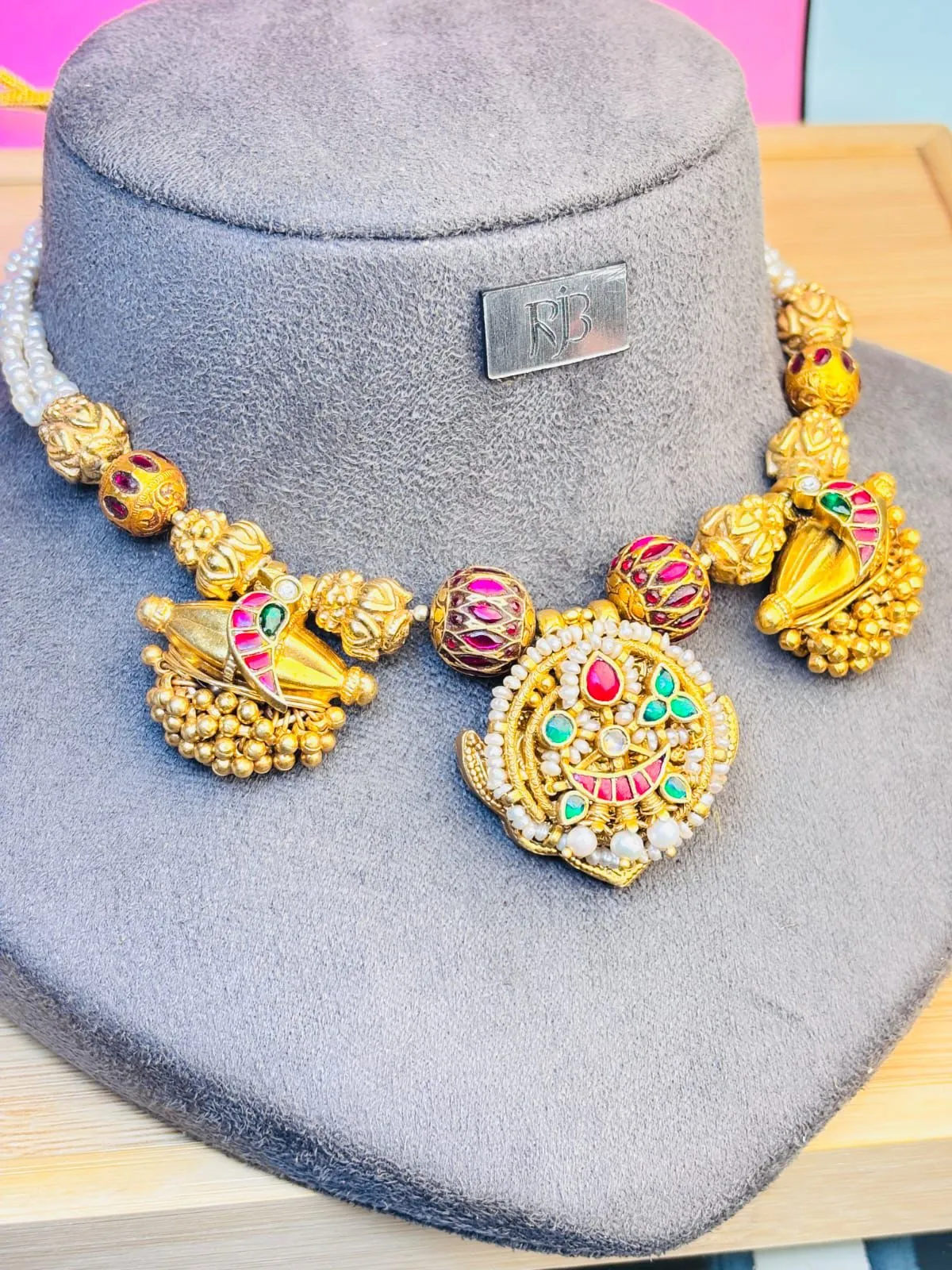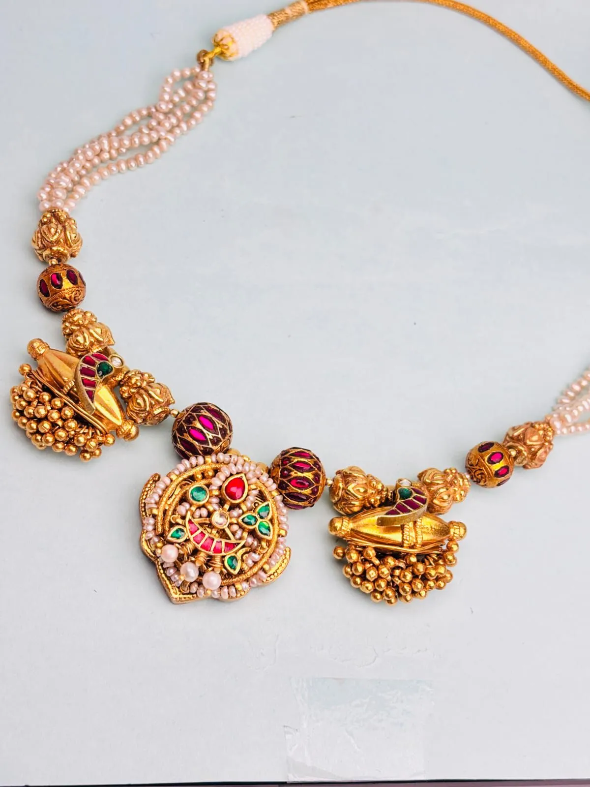 The necklace features beautifully hand-crafted meenakari work in rich red and green hues, accentuated with antique gold finish that enhances its regal charm. The design is adorned with freshwater pearl strings and detailed motifs, giving it a luxurious and festive appeal. Delicate bead drops add graceful movement and elevate the overall look.