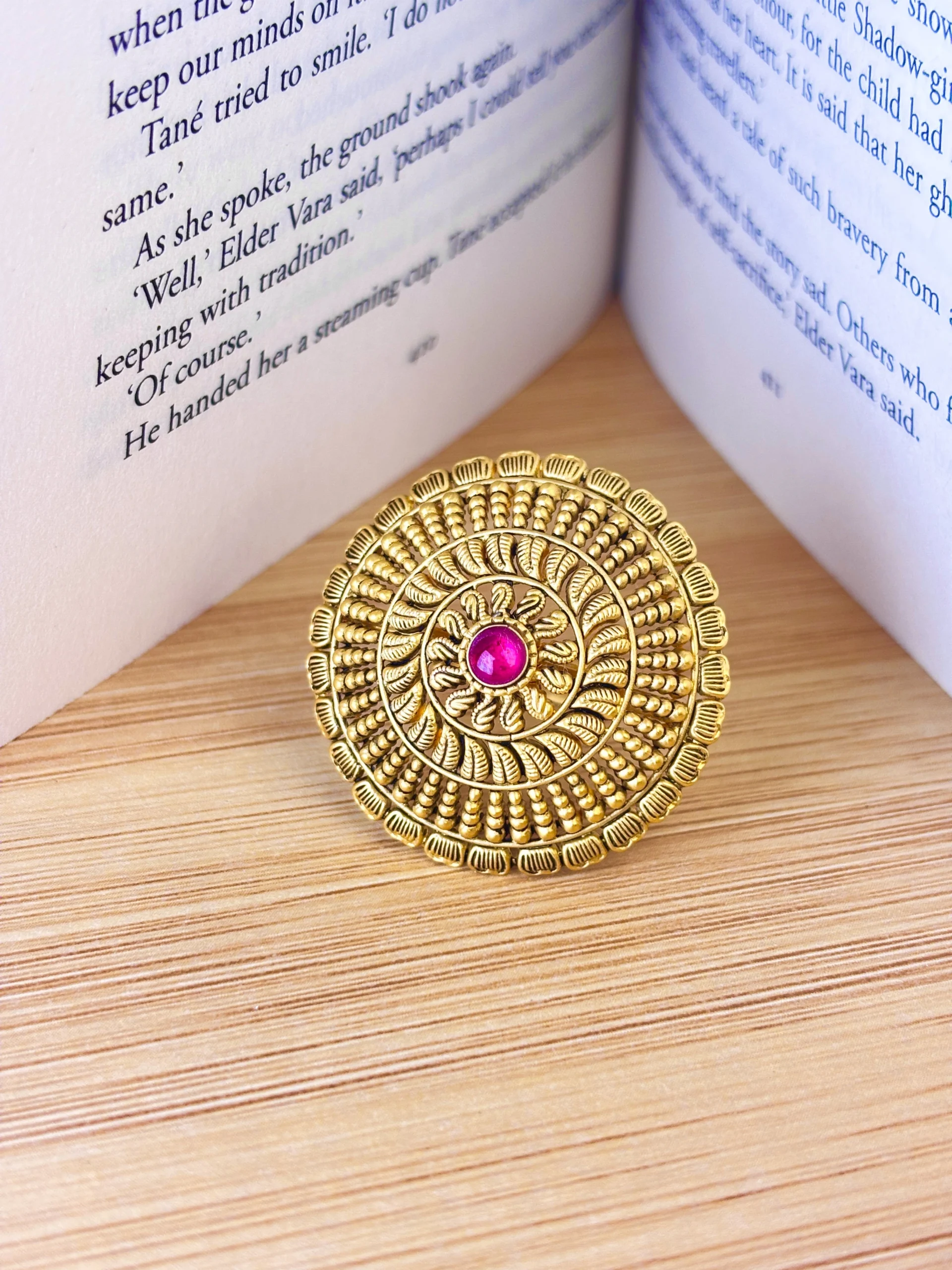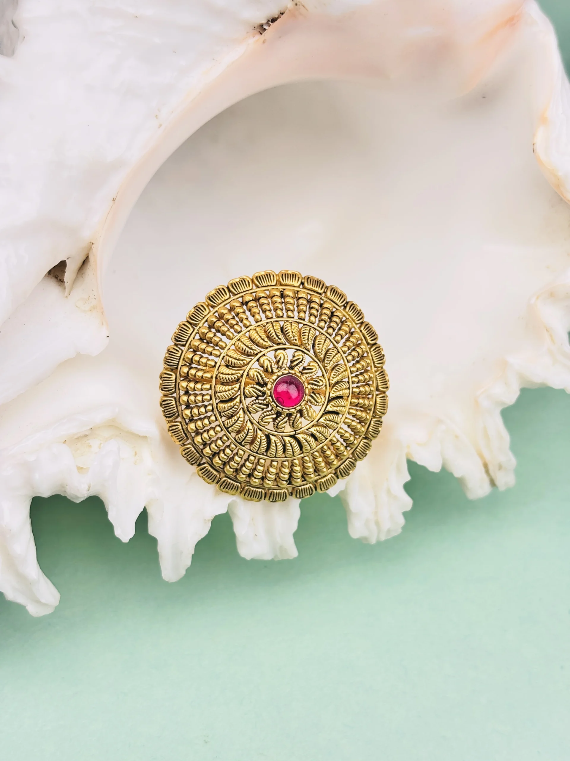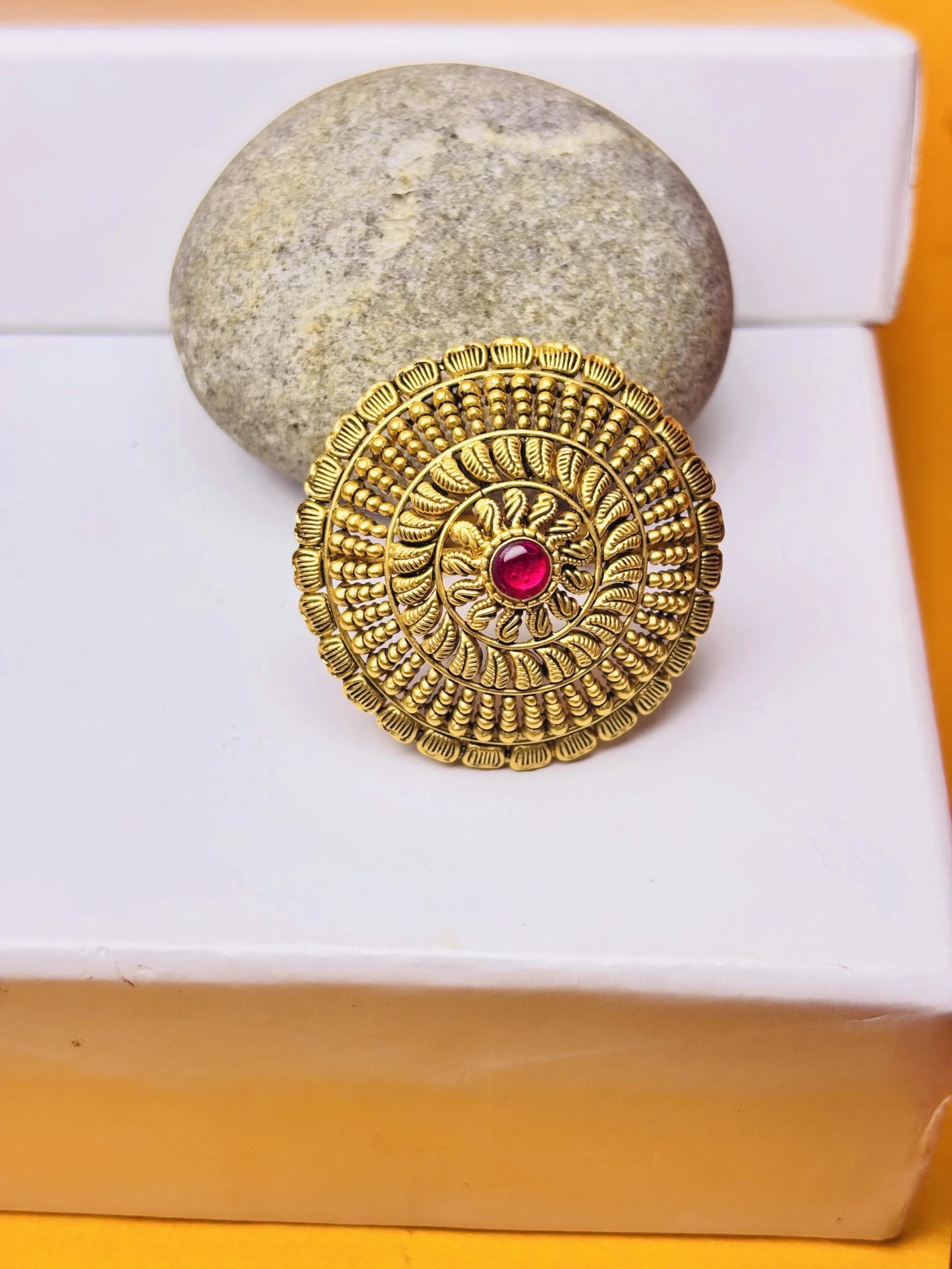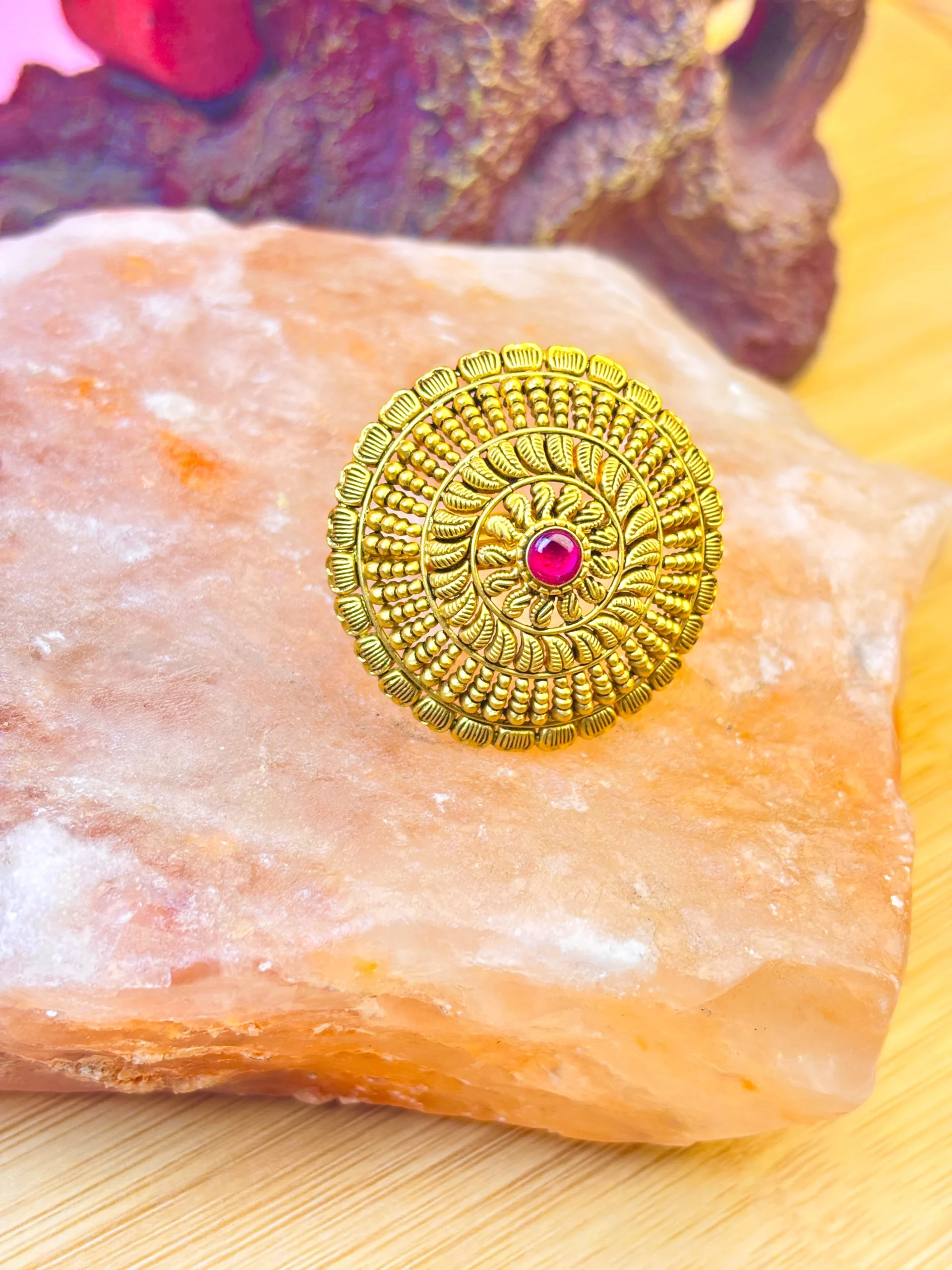 22KT Gold Antique Temple Ring with Pink Stone – Heritage Statement Jewellery | Rashmi Jewellery Boutique Hisar