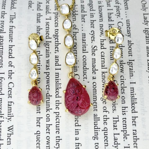 Floral Carved Ruby-Inspired 925 Silver Pendant Set with Crystal Accents – Gold Finish Necklace & Earrings