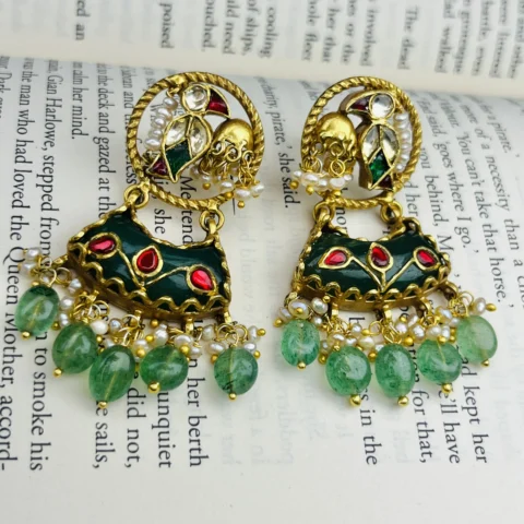 Green Onyx & Pearl Drop 925 Sterling Silver Gold-Plated Chandbali Earrings