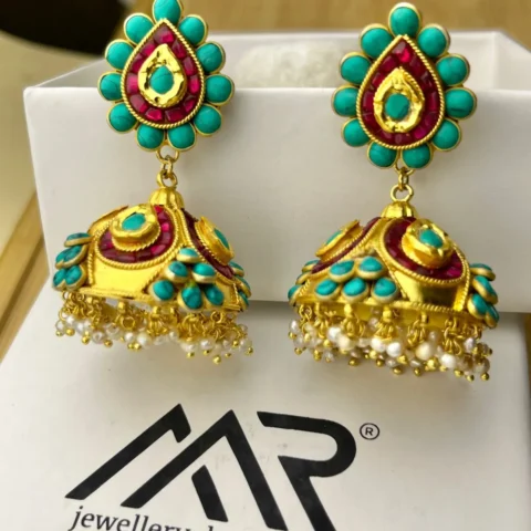 Turquoise & Ruby-Inspired 925 Silver Jhumki with Pearl Drops – Traditional Gold Finish Ethnic Earrings